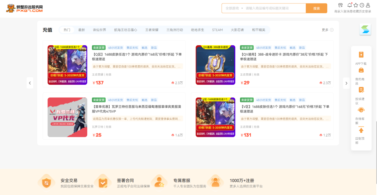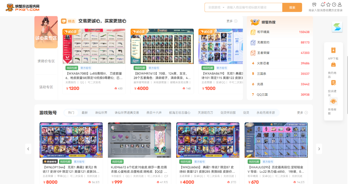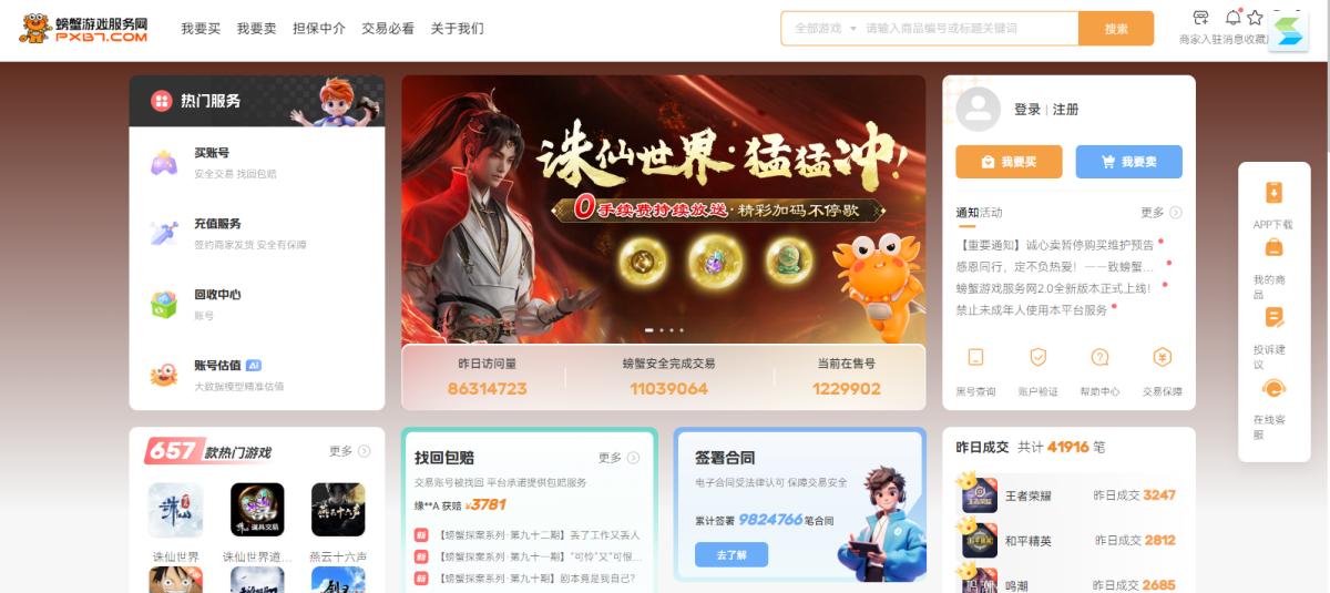 螃蟹账号是涵盖手游、端游、Steam等全品类游戏交易软件,提供买号、卖号、账号回收、账号估价、装备道具等一系列专业游戏服务。平台提供免费包赔、全额包赔、双倍包赔、三倍包赔等服务,有效保护用户权益,让交易更安心。