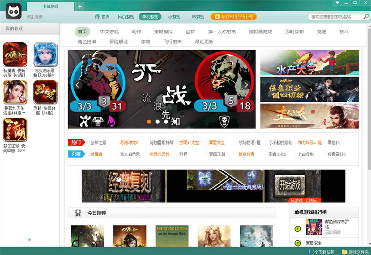 2、一键安装 简单省事:只需轻松一点,游戏大厅便可实现游戏的下载、安装、运行,减少用户麻烦,节省玩家时间