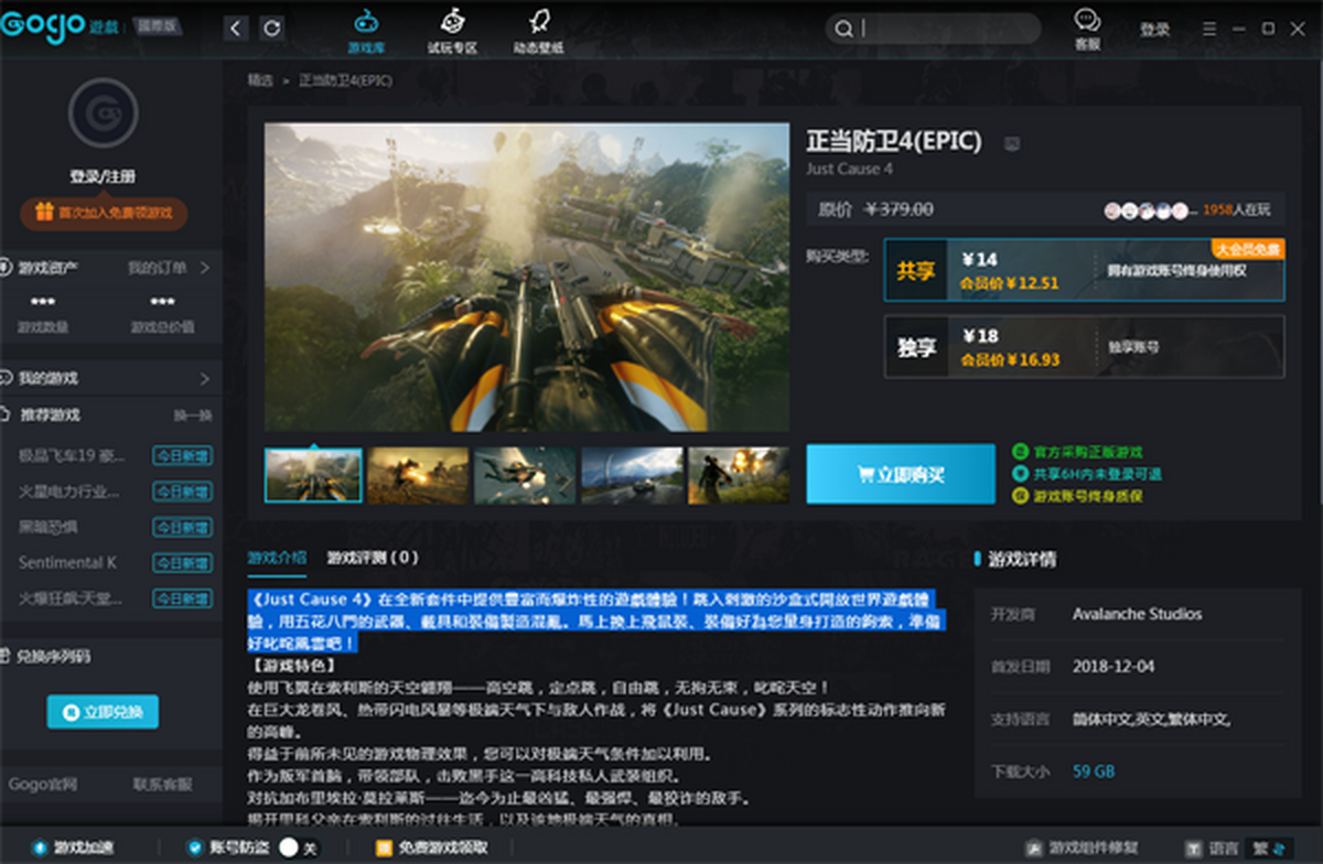 《正当防卫4》在全新套件中提供丰富而爆炸性的游戏体验!跳入刺激的沙盒式开放世界游戏体验,用五花八门的武器、载具和装备制造混乱。马上换上飞鼠裝、装备好为你量身打造的钩索,准备好叱咤风云吧!