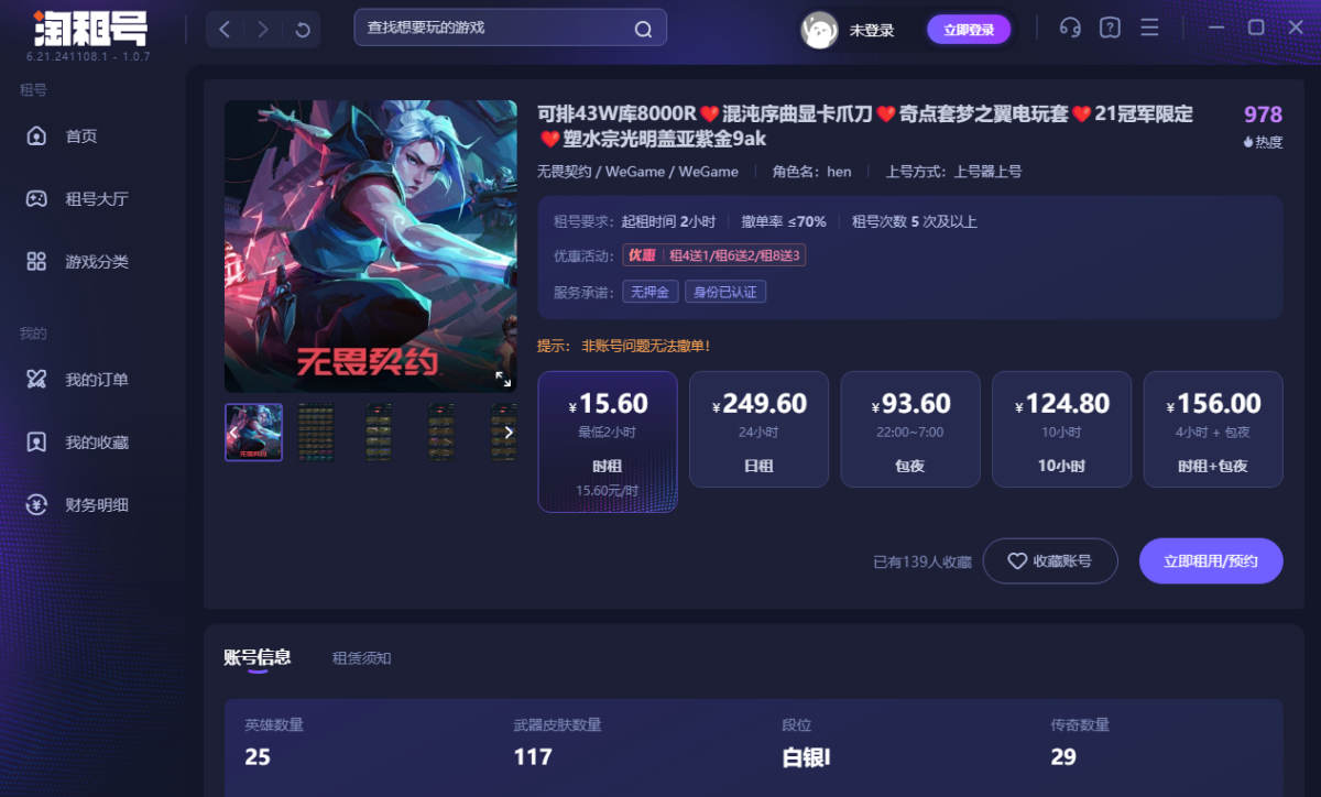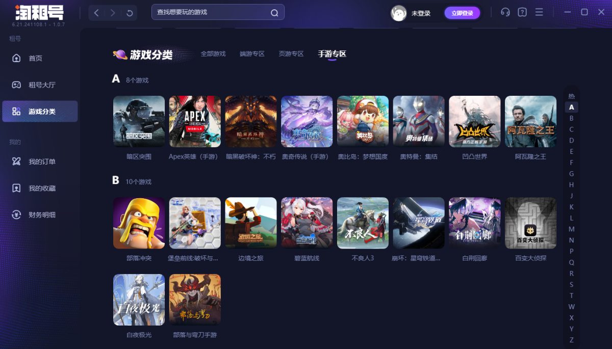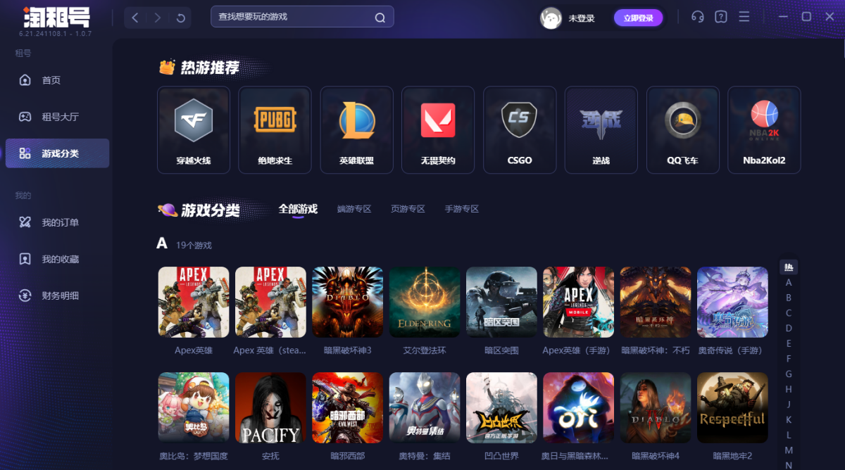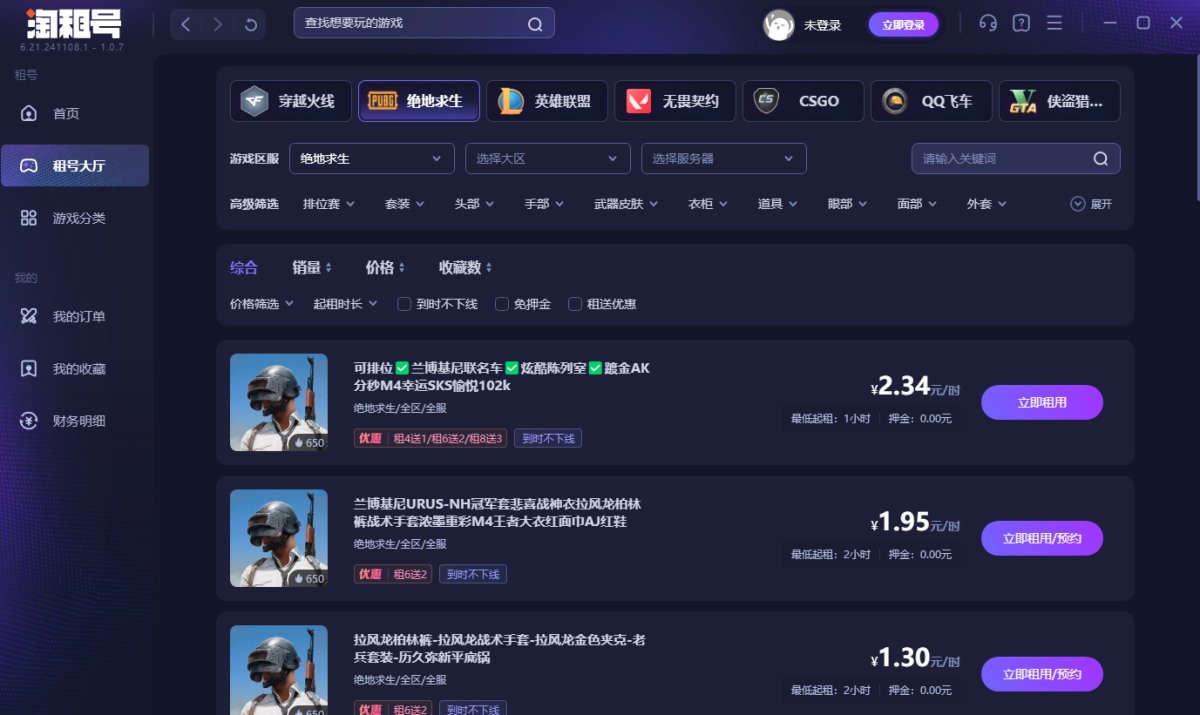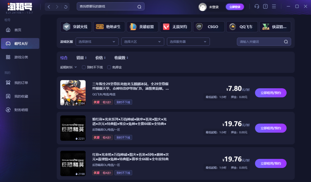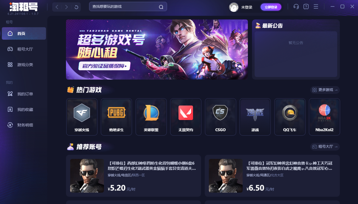 淘租号是中国网络游戏账号租赁服务商,游戏玩家账号租赁平台。海量账号出租,玩家无需账号密码即可畅玩CF(穿越火线)、LOL(英雄联盟)、PUBG(绝地求生)等游戏的极品号,高端绝版稀有装备,价格便宜,多租多送,让你体验畅玩的乐趣!