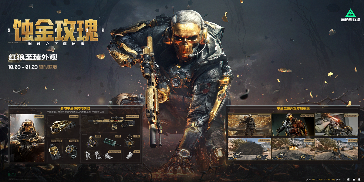 爆炸响起 流弹纷飞,火光冲天 遍地流金,黄金玫瑰和华丽乐章随一切肮脏秘密隐入尘烟,特战干员红狼,将圆满完成任务;10月3日-1月23日红狼的至臻外观【蚀金玫瑰】限时亮相各位干员,一起行动共同迎接这场暗夜中的华丽冒险。