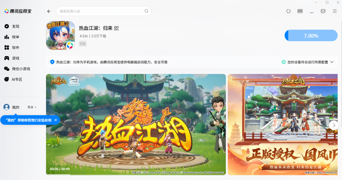 在万家下载站下载最新安装包,按提示先安装应用宝电脑版(已安装会直接调用打开,未安装应用宝时,手机APP无法独立在电脑上运行),应用宝启动后会下载安装游戏,待安装完成后即可开始畅玩。