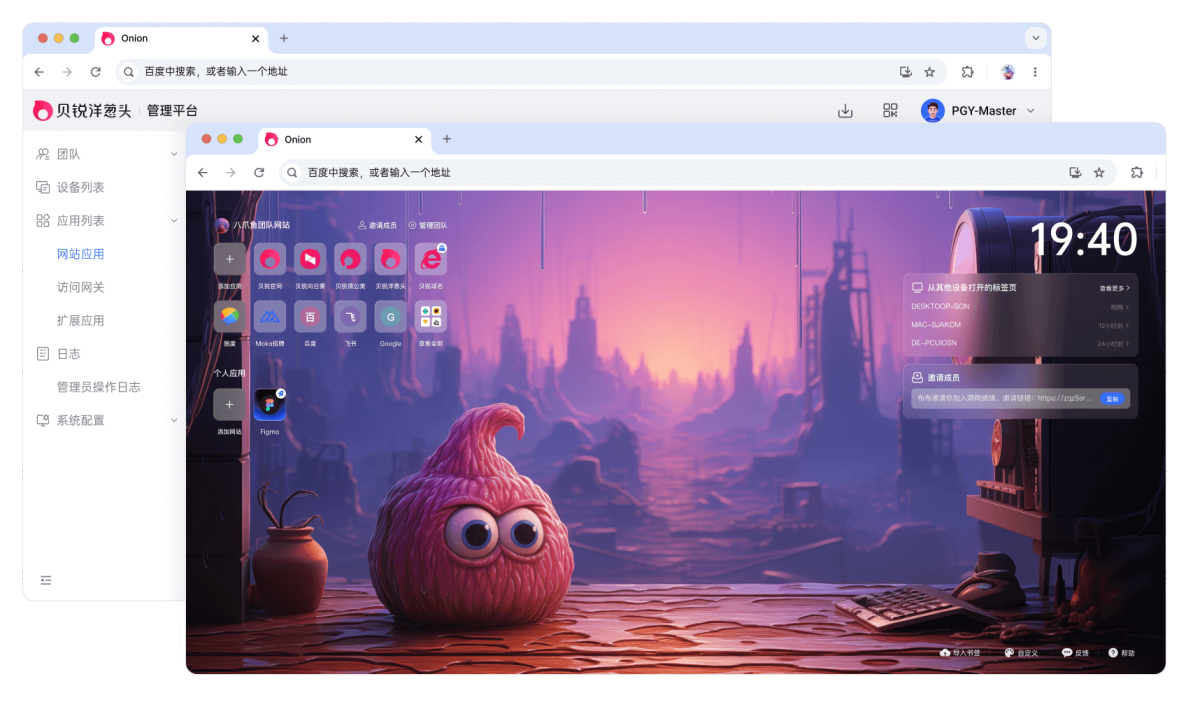 洋葱头的使用包括管理员与成员两类角色。管理员除了基础的浏览功能外,还可以通过控制台设置位于内网或互联网的业务网站并配置网站策略。成员无论在公司内外、居家办公或出差途中、登录设备是否支持VPN、WPS等工作软件,只需要下载洋葱头浏览器,便可以安全地访问这些网站。对一些互联网上访问比较慢的网站,管理员还可以设置对这些网站进行加速,洋葱头通过缓存,资源重定向等技术手段实现这一点。在经过加速后,团队成员在访问这些网站时体验会明显改善。