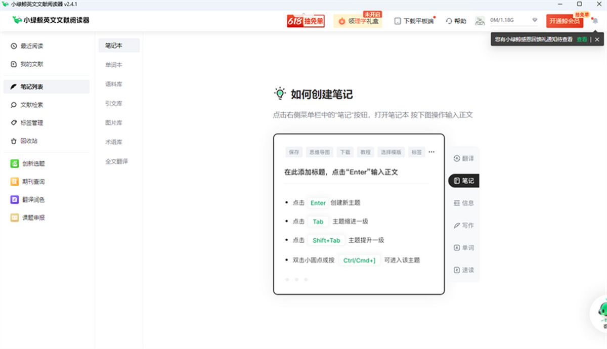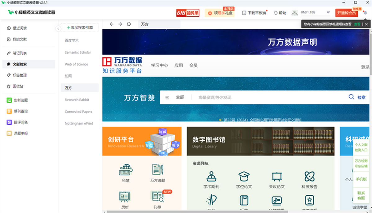 在读文献的同时可进行翻译、批注、做笔记,还具有文献管理和知识管理功能。