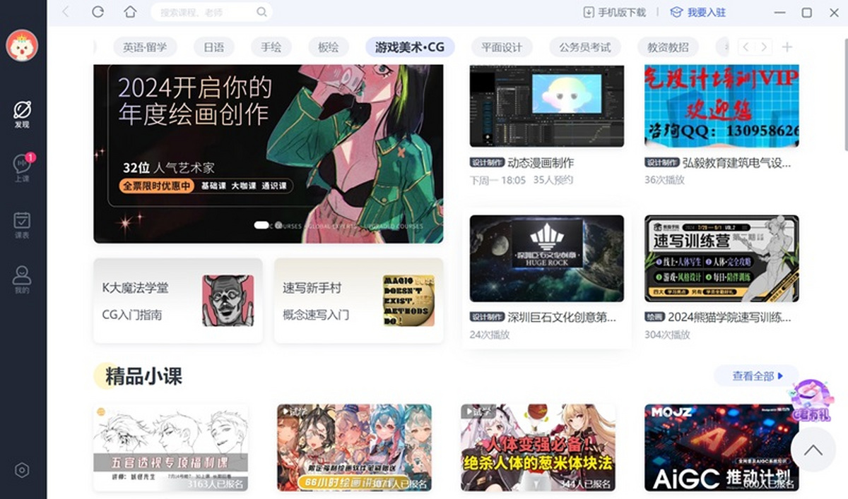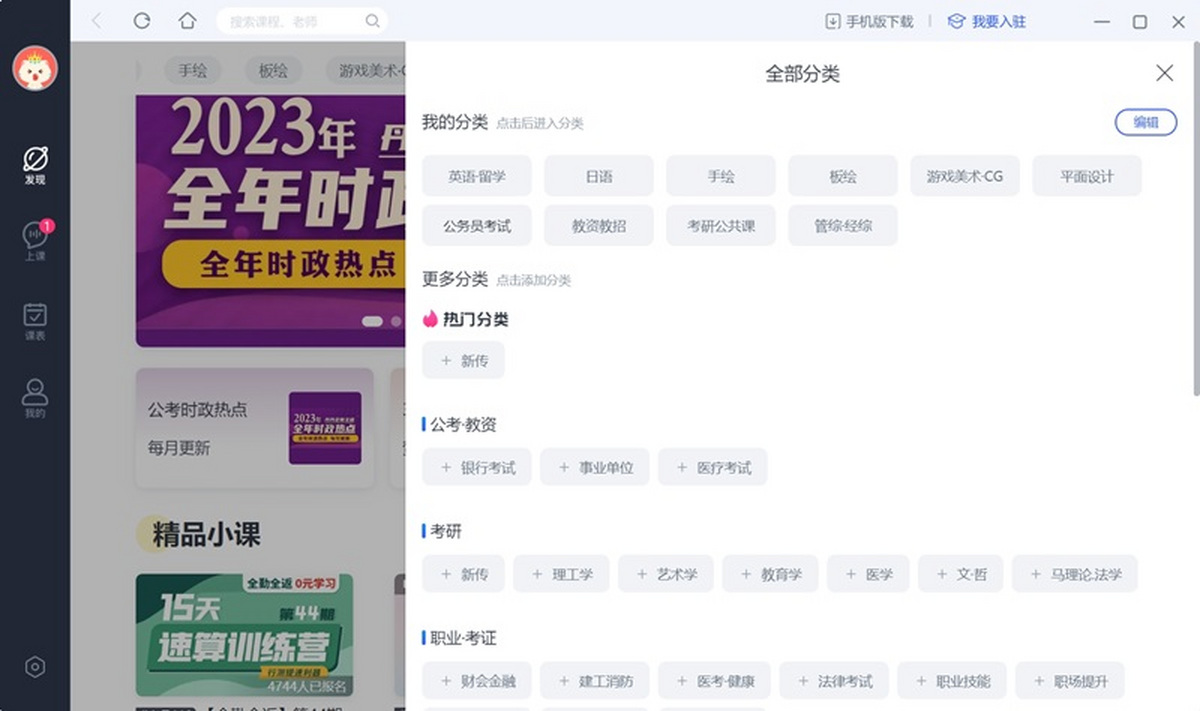 英日韩法德西小语种等多种语言学习应有尽有!考研、公考、IT、设计、职业技能学习助你职场加分!绘画、摄影、音乐、运动健身兴趣学习让生活丰富多彩!不管你是谁,你想学啥,来这里准保没错!