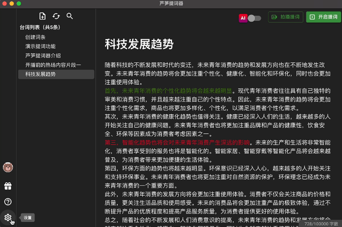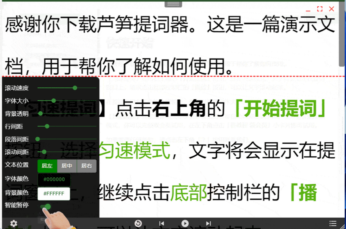 芦笋提词器可进行个性化自定义设置,如字号大小、背景颜色、滚动速度、还有 AI 智能跟读功能,让您的演讲更顺畅。