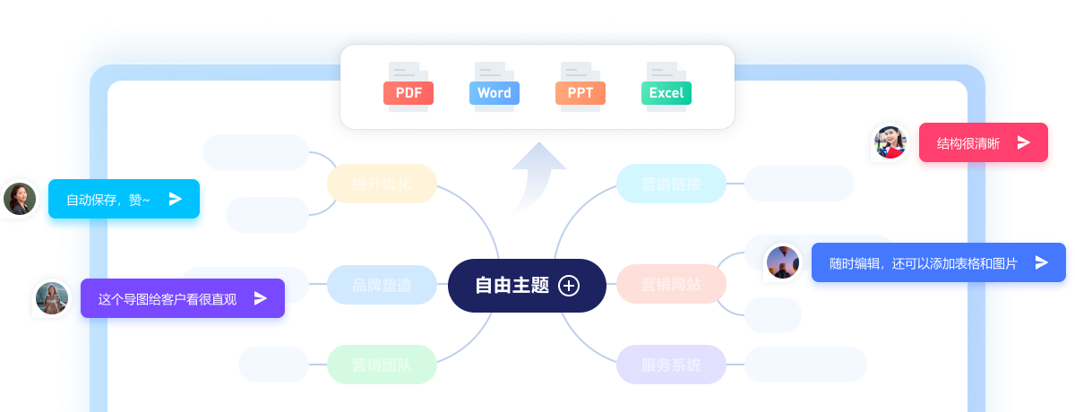 迅捷思维导图,轻松记录你的思维火花,支持在线创作,随时记录下一闪而过的思维火花。内容以平面展开形式呈现,激发对内容的思考与联想。多种格式导入导出,跨平台不再受阻。云储服务让创作不受设备约束,随时随地将分散且有关联的内容轻松连接起来,发挥创意,捕捉灵感。