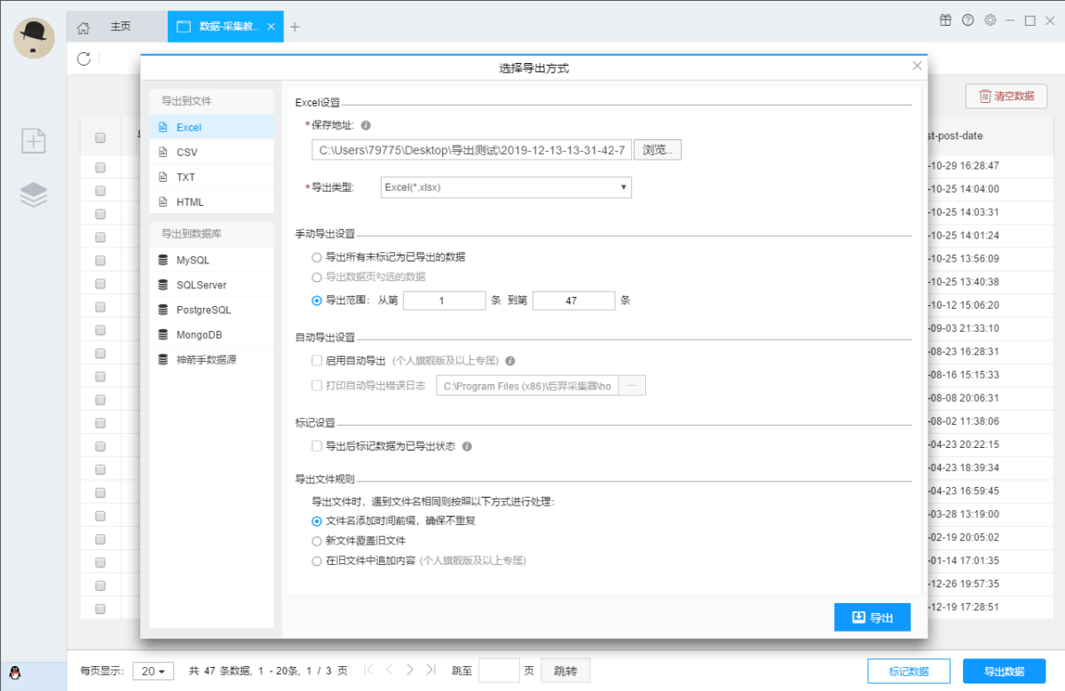 采集结果可以导出到本地,支持TXT、EXCEL、CSV和HTML文件格式,也可以直接发布到数据库(MySQL、MongoDB、SQL Server、PostgreSQL)供您使用。