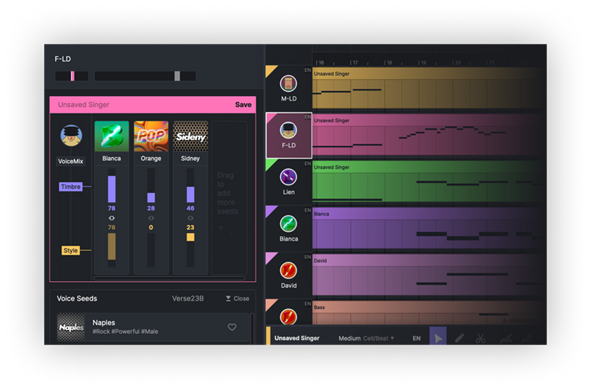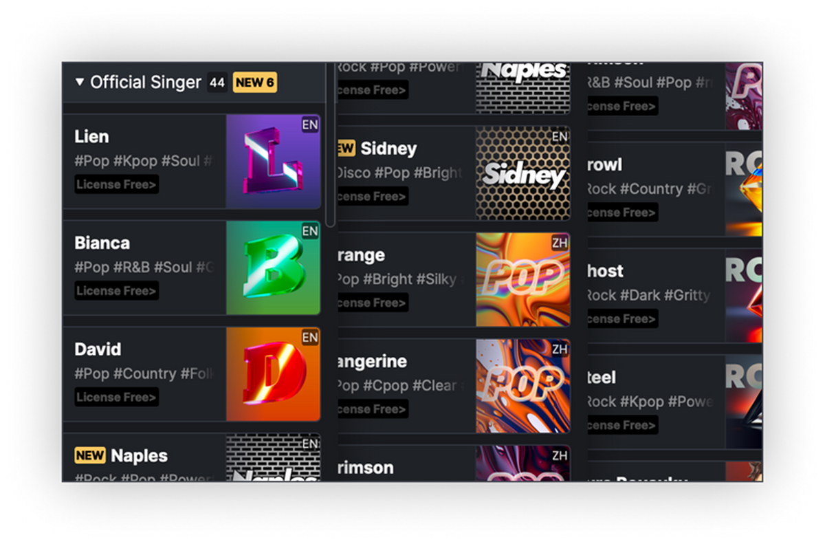 ACE Studio提供从流行到民歌,从童声到摇滚嗓,各种高水平AI歌手满足用户全场景音乐制作需求;让AI歌手表达音乐的每一处细腻情感,从多维度AI演唱参数到高质量的合成效果,使用毫不妥协的全流程AI技术,不断追求提升虚拟歌手的歌声自然度与表现力。