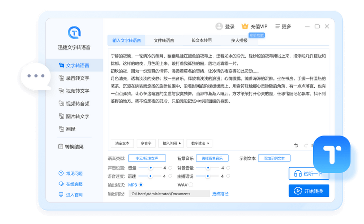 迅捷文字转语音是一款集文字转语音,语音、录音转文字为一体的语音文字转换器软件,专业的文字转语音播音系统可将文字转成多种语音类型与格式,用户通过设置音量、语速、语调等即可获得满意的音频文件.