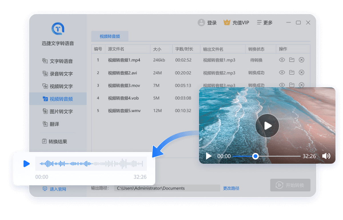 支持一键将avi、mkv、mov、mp4等格式的视频转换为音频文件,转换速度快,不失真,轻松提取视频中的音频
