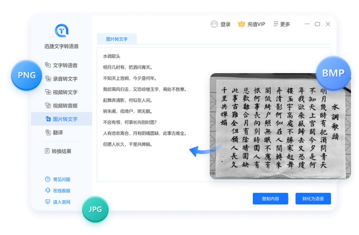 添加png、jpg、bmp等格式的图片后,系统会自动提取图片中的文字,可对识别结果进行复制或转换为语音