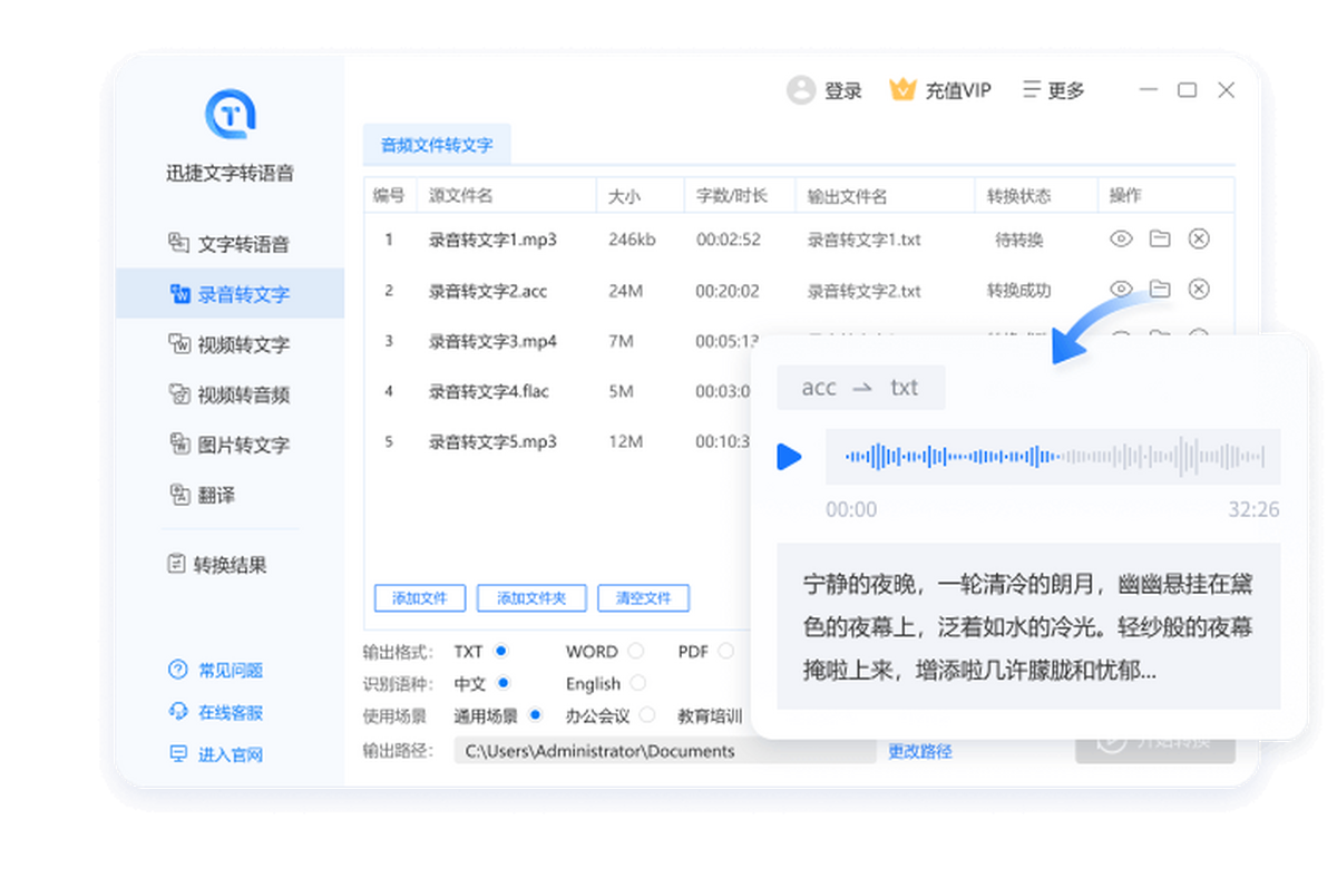 支持将mp3、m4a、wma等音频格式转换为txt、word、srt等文本格式,可批量转换,包含方言的音频也可转文字