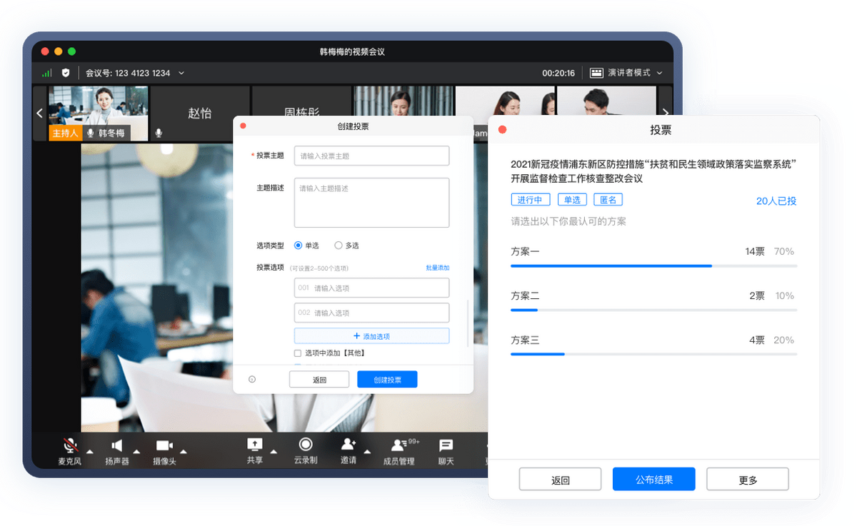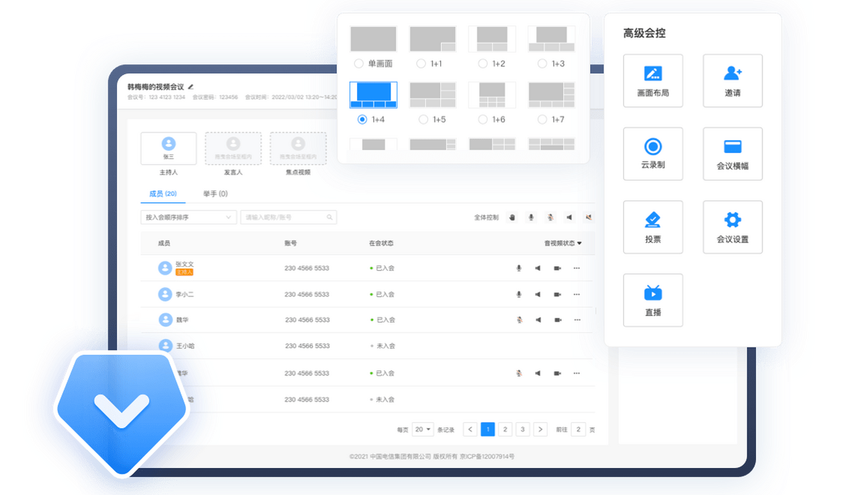 专业行政会议,支持32种自定义画面布局、会议横幅和会议轮询