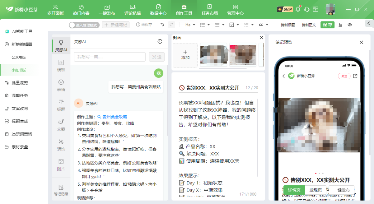 新榜小豆芽支持50+自媒体平台,100个自媒体账号的同时管理,支持视频、图片和文章类型的作品发布,同时提供多种内容创作工具,如:编辑器、AI创作工具等,一站式解决从创作到排版到发布的问题;