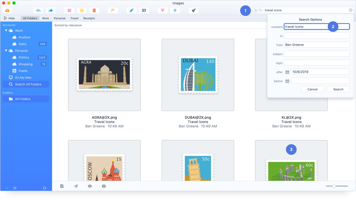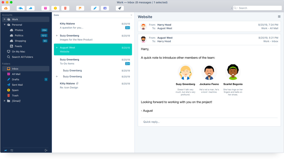 Postbox Mac版支持多账户,可以为不同账户分类,统一管理,不再累于账户切换,极大简化了操作。软件的经典窗口布局加多标签的设计,使 UI 整体有序,又不失灵活。Postbox Mac版不仅对多账户处理有道,对邮件的处理更是强大:同主题的邮件往来不仅在标题列表中被显示为直观会话。