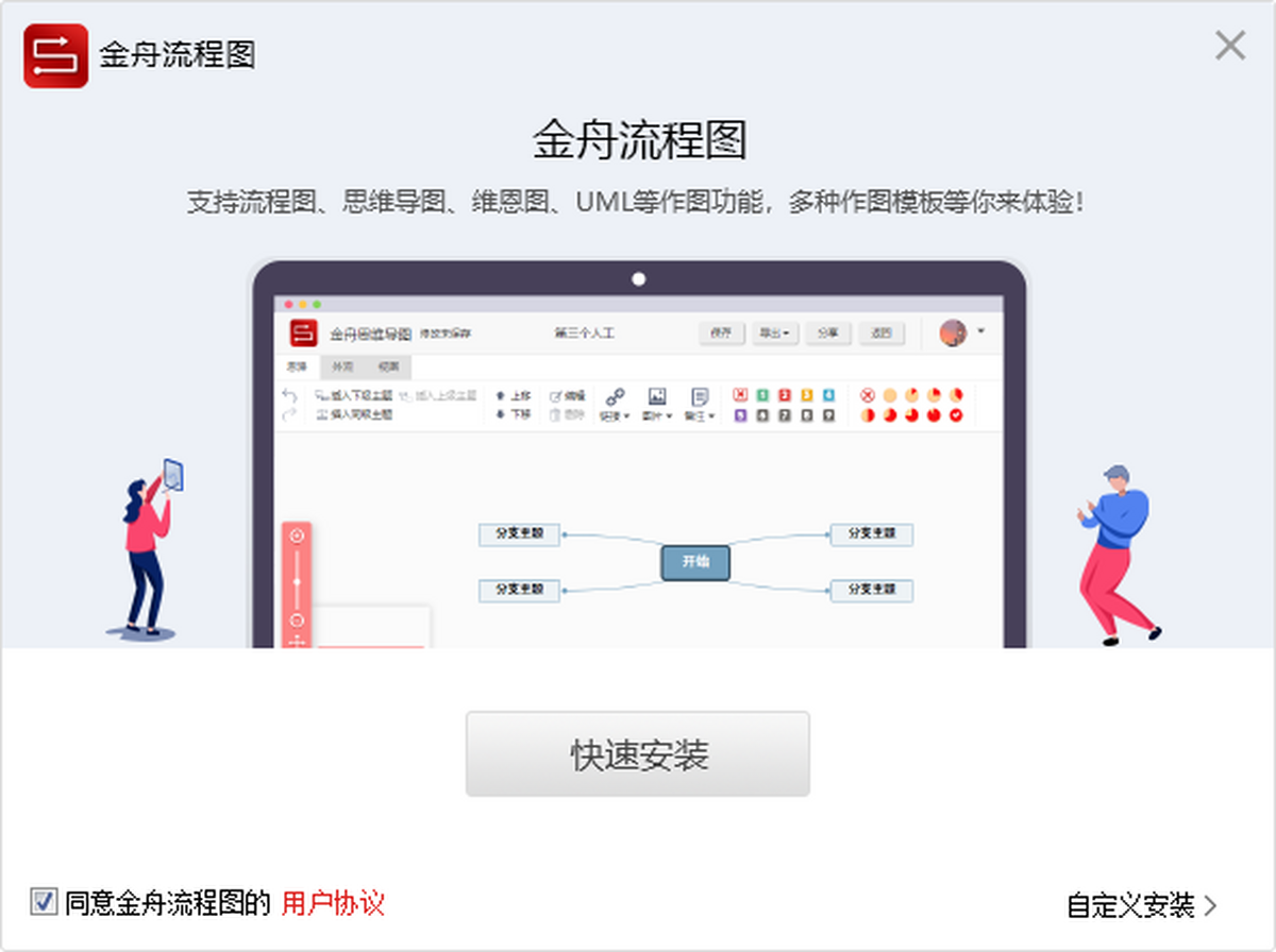 金舟在线流程图是一个在线协作绘图平台,为用户提供最强大、易用的作图工具!支持在线创作流程图、思维导图、脑图、组织结构图、网络拓扑图、BPMN、UML图、UI界面原型设计、iOS界面原型设计等;同时依托于互联网实现了人与人之间的实时协作和共享。