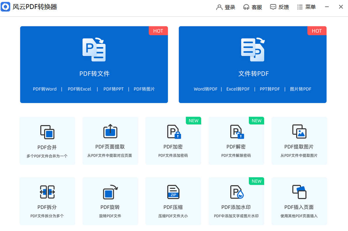 风云PDF转换器支持PDF与Word、PPT、Excel、图片等文件的批量互转,新增PDF合并拆分、PDF压缩、PDF页面提取等附加功能,最大精准度地保留所有原始数据和布局。