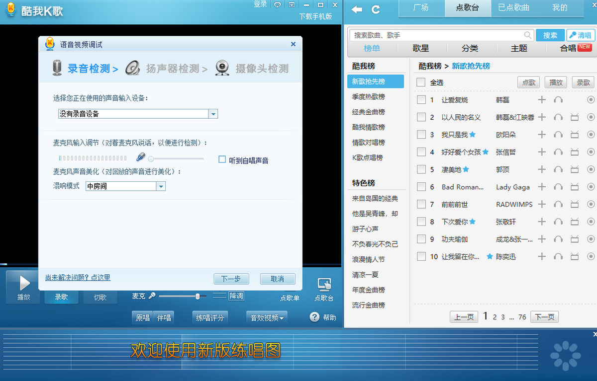 找一首喜欢的歌曲,点击“录歌”按钮就可以开始录制歌曲了。此时只要跟着音乐演唱即可。软件会把你的声音录制下来。怎么知道自己唱的对不对好不好呢,酷我K歌还专门提供了“练唱图”功能,在录制过程中只要单击“显示练唱图”按钮即可显示一个图示窗口,在这个窗口中会显示两条曲线,一条是原唱曲线,一条是自唱曲线。在录制过程中软件会根据你演唱的音调和音准等用曲线进行对比,两条曲线越接近说明唱得越准,反之则越差。同时还会用一个笑脸娃娃同步提示你应该注意什么,比如声音太大,唱得跑调了等,很有意思。有这样的练唱图示做指示,演唱起来心中就更加有谱了,会越唱越好。