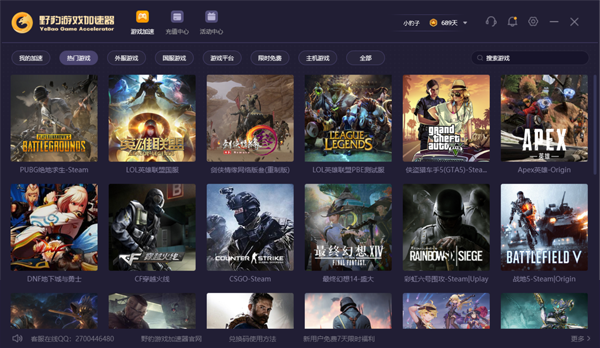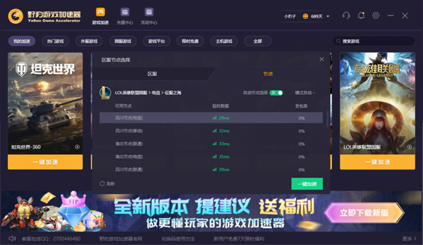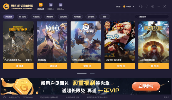 6、登录后可参与各种新用户福利活动,免费获赠野豹加速VIP服务,除此之外不定期还有各种游戏道具、礼包赠送。如需立即玩游戏,则可通过搜索功能,或菜单功能,选择您即将加速的游戏,点击“一键加速”按钮。