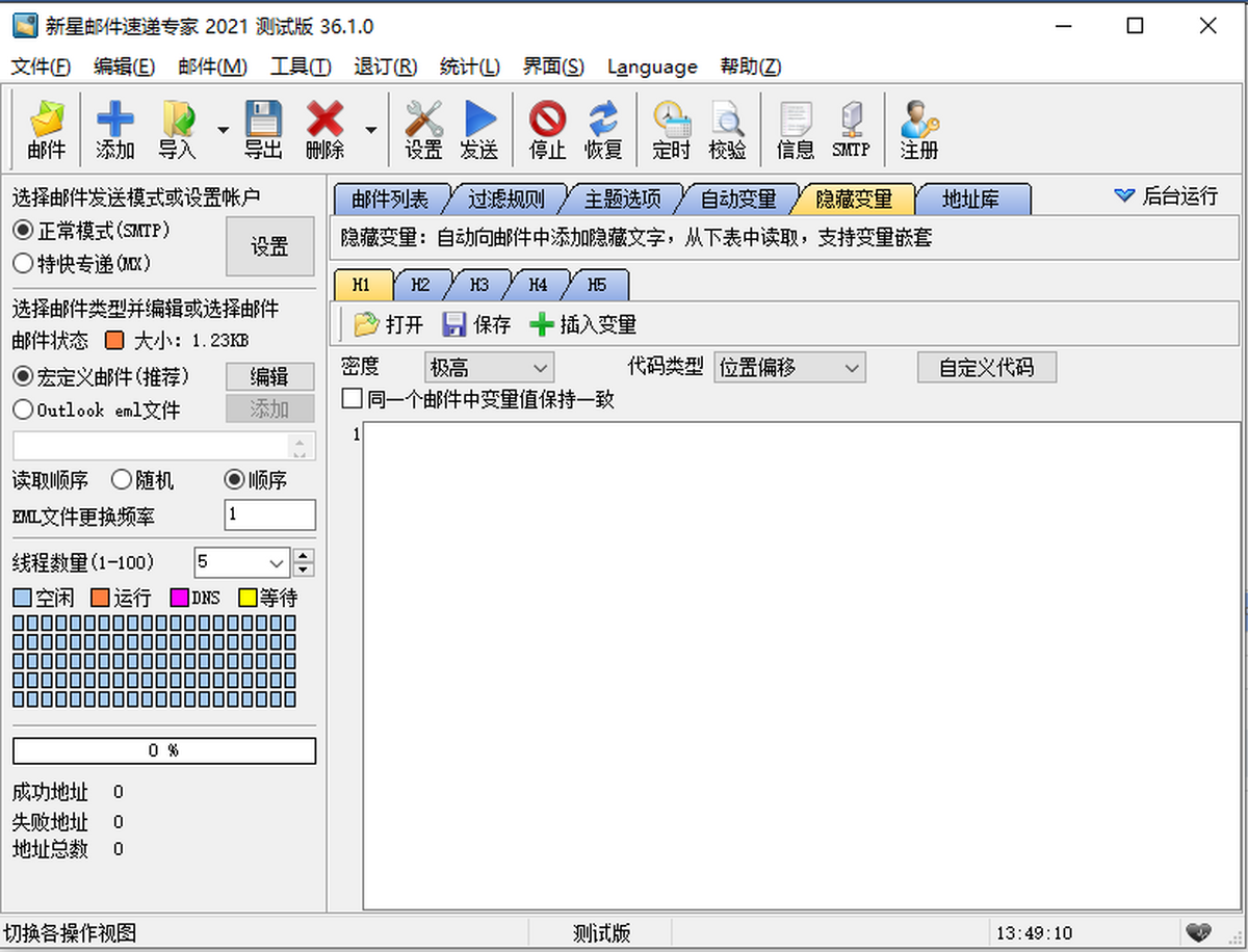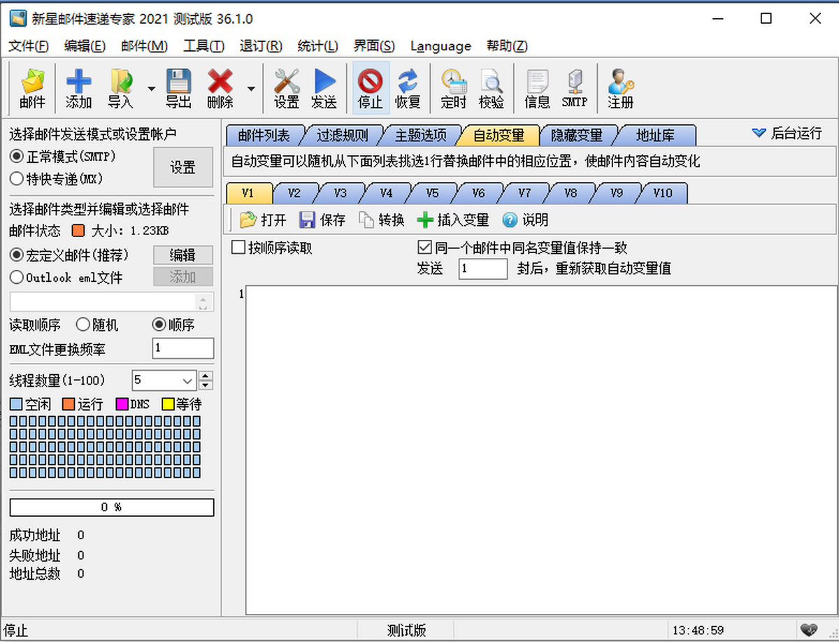 + 邮箱设置-{发送x封,暂停使用y秒},当y<=0时,可以控制邮箱同时使用的线程数(例:当x=1,只允许1个线程使用)
