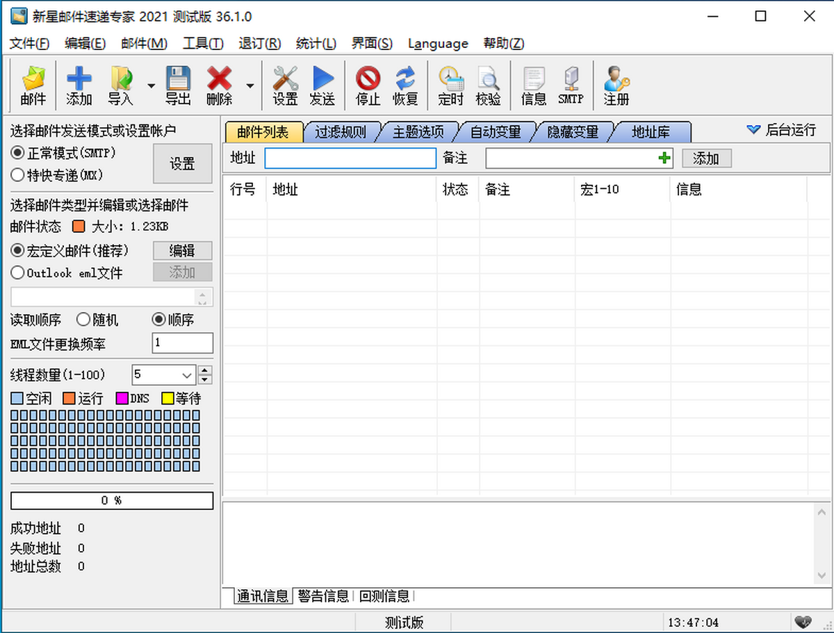 + 回测记录框,右键菜单可以重置回测(重新计数、重新从第一个回测收件人开始)。