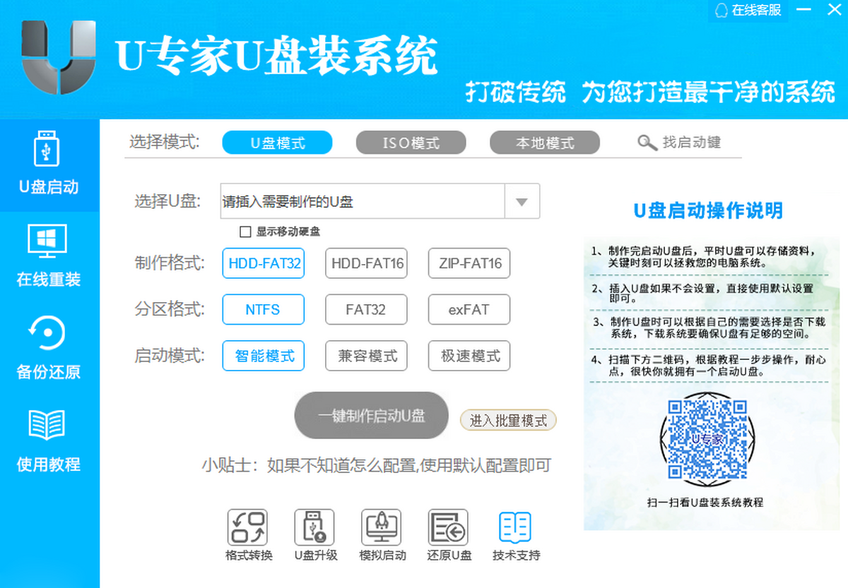 U专家U盘装系统工具是一款界面美化、操作简单、即下即用的启动U盘制作工具,真正做到了一键下载,一键安装,一键装机的便捷,只要轻松一键,电脑就能恢复到最佳状态,电脑城装机和维护人员使用,更专业,更高效,个人用户使用,更简单,更安全。