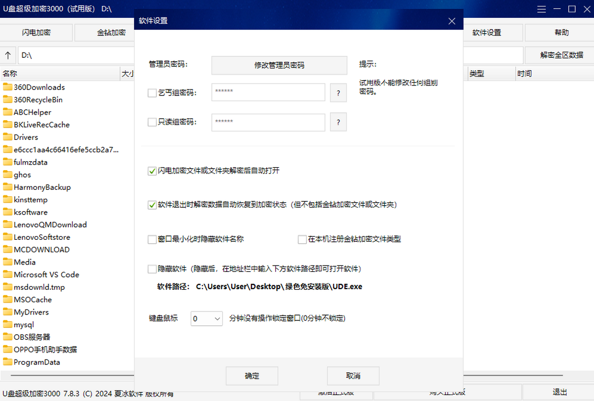 U盘超级加密3000主要用于U盘加密和移动硬盘加密,解决U盘、移动硬盘中的数据泄漏等问题,有效保护移动存储设备中的数据安全。U盘里的文件和文件夹加密后,不受电脑限制,可以在任意一台电脑上使用,具有完美的移动性。文件和文件夹加密后保密性极高,不解密任何人无法看到里面的内容。U盘超级加密3000是一款纯绿色软件,不需要安装,也不会在系统里写入任何数据,只需把软件放到需要加密的U盘、移动硬盘里即可。