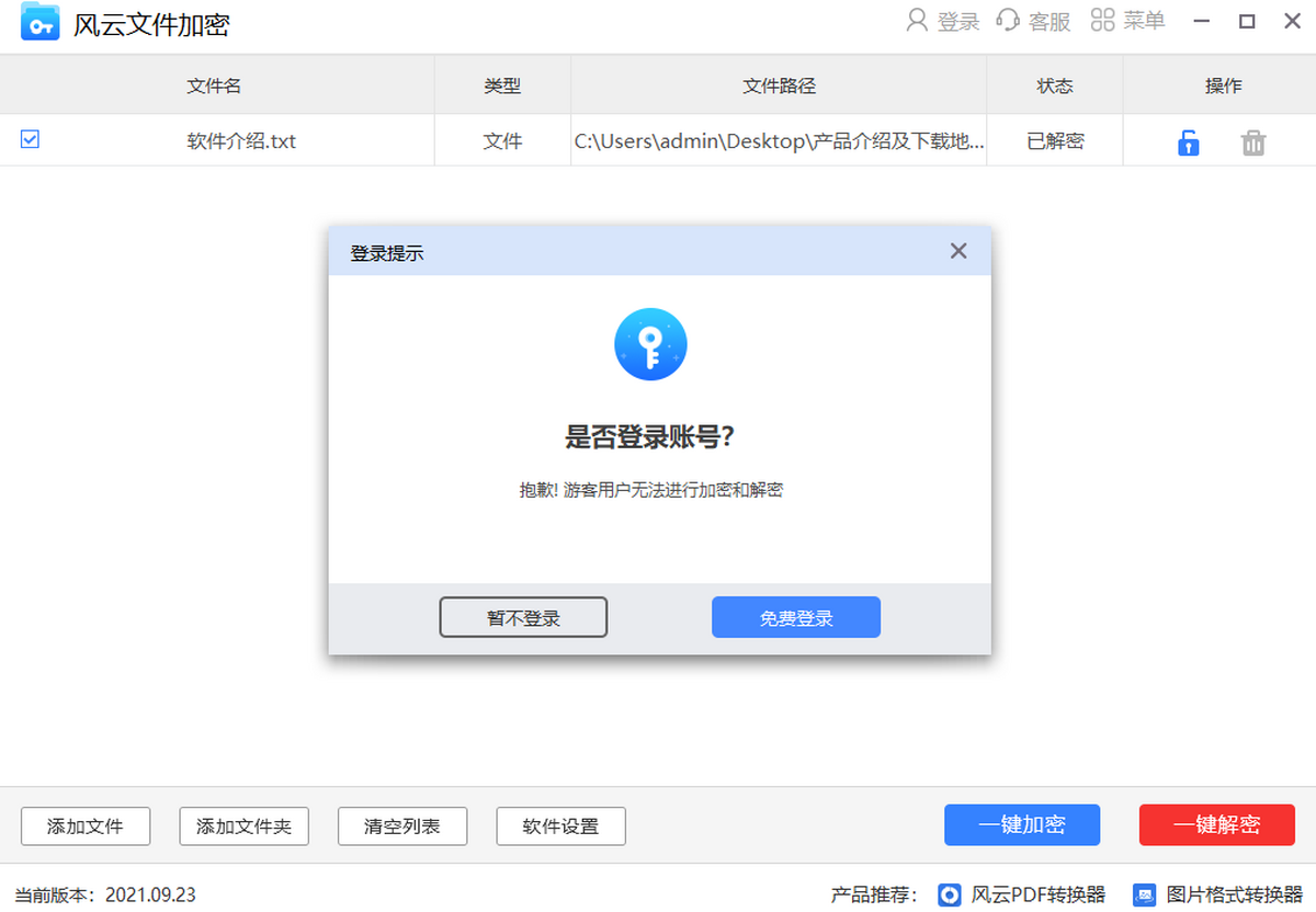 风云文件加密是一款功性强大、操作性简单、安全性极高的加密软件,可以进行文件加密解密等处理,让文件固若金汤。
