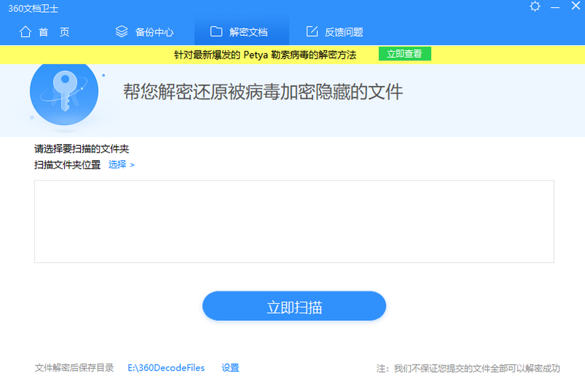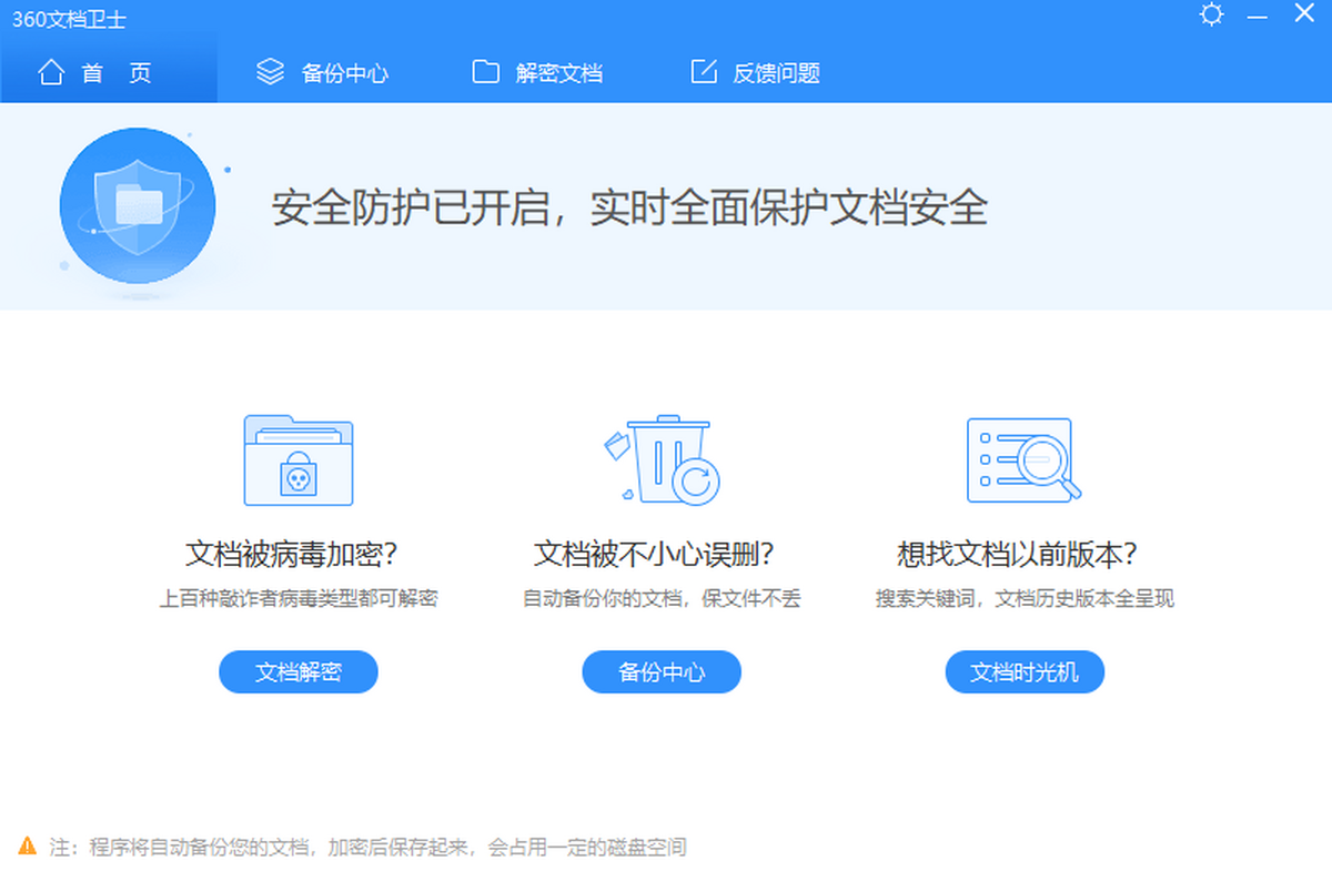 360文档卫士官方版是奇虎360专门针对勒索病毒开发的文档保护工具,有效保护用户的文档安全,并且360文档卫士自带自动备份功能,保护你的文档被加密、被恶意篡改,软件专门针对勒索病毒打造,开启针对性的保护,是预防勒索病毒的重要工具。
