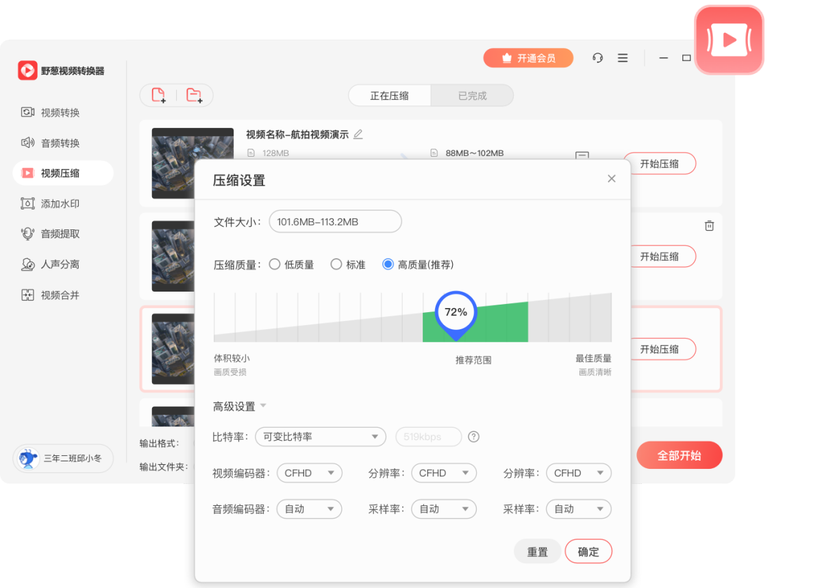 野葱视频转换器,支持1000+音视频格式转换,自由调节分辨率、比特率、帧数、音质效果等内含视频转换、音频转换、视频压缩、人声分离、音频提取、视频合并、视频水印、视频转gif等多种特色功能。