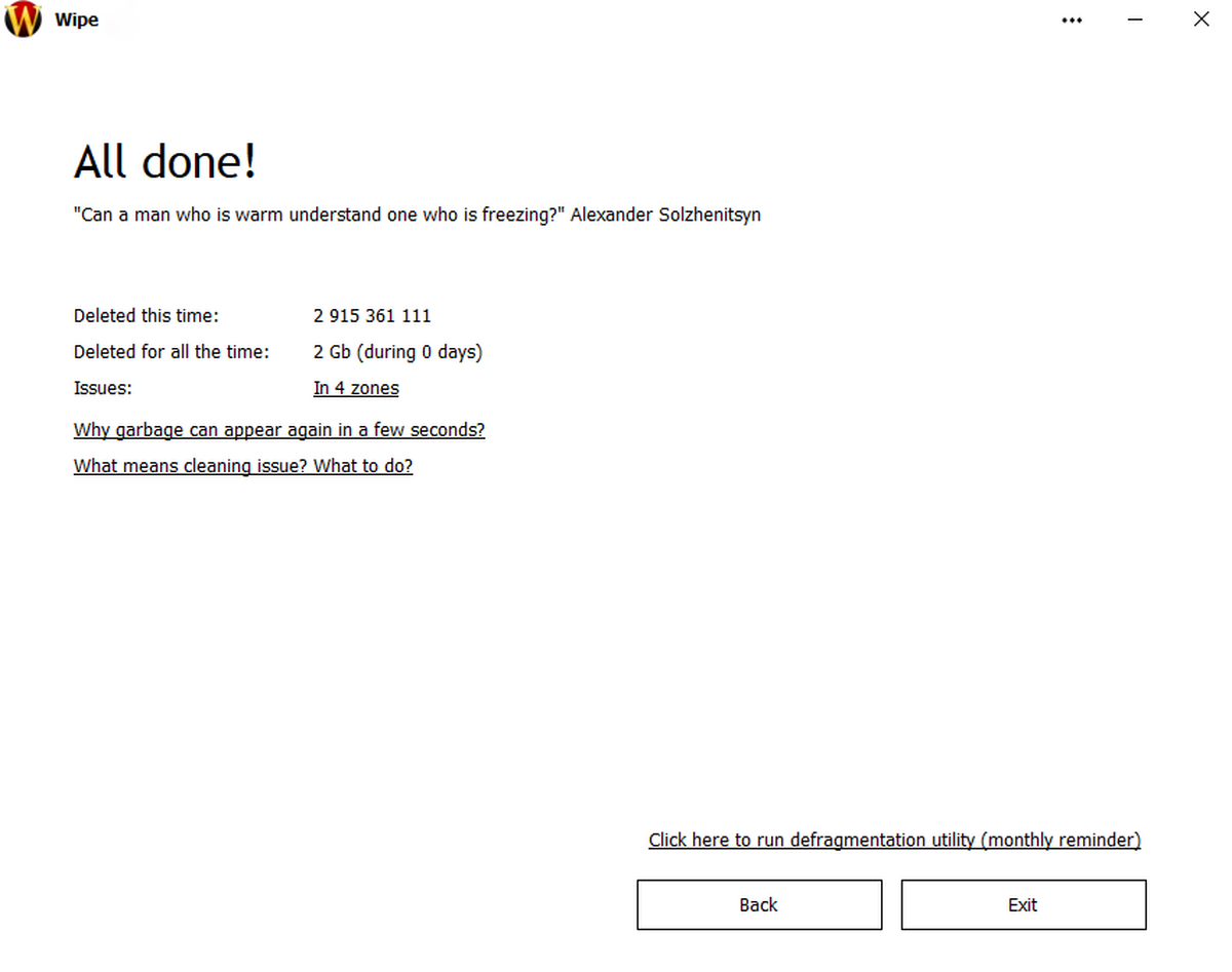 wipe是一款功能十分强大的电脑清理工具,电脑使用痕迹、浏览器历史记录、cookie、缓存、临时文件、搜索记录等都可以使用wipe来进行清理,操作简单便捷,能有效保护用户的个人依稀,彻底杜绝相关数据被恢复的可能。