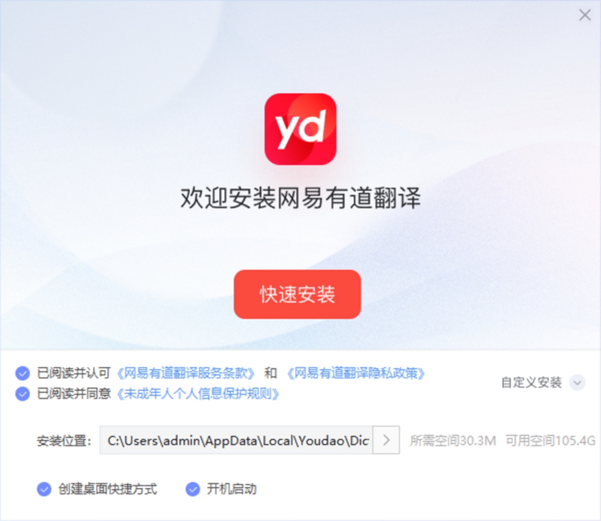 1.从万家安全下载站下载网易有道翻译软件包,进入安装向导,勾选上用户协议并单击【自定义安装】
