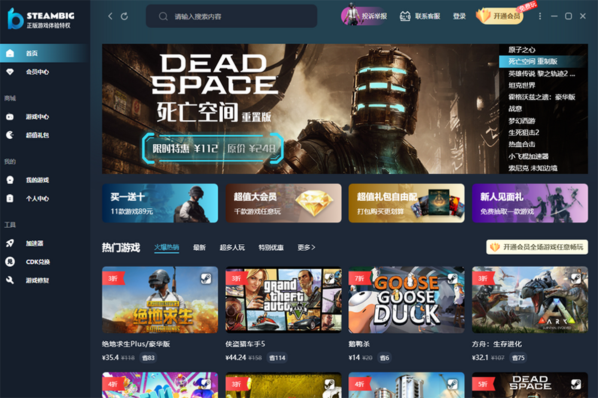 STEAMBIG是一款款专为游戏玩家定制,提供3a大作游戏购买、游戏网络环境加速等综合服务的应用。在这里你可以寻找自己喜欢的各种游戏,详细的了解其玩法及一些小技巧,更有免费游戏领取、游戏共享、等特色趣味玩法功能。