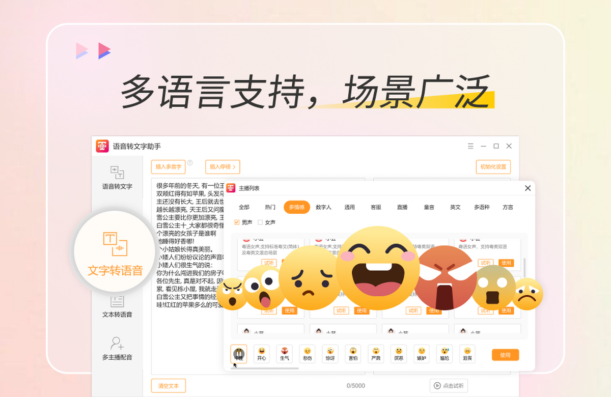 童音、方言、英语、日语、粤语等各种音色的主播任君挑选,总有一个Ta让您心满意足
