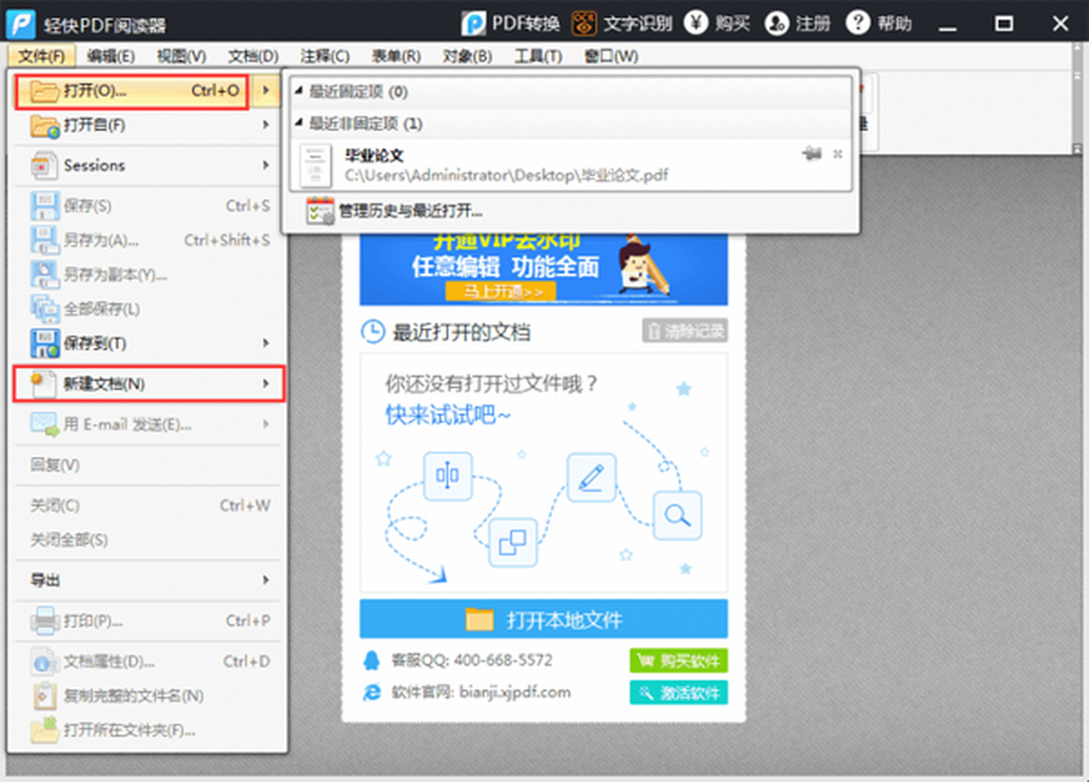 “文件”——“打开”,选择电脑中的PDF文件,即可打开PDF文件进行阅读。除此之外,还可以通过“新建文档”按钮,创建一个新的空白PDF文件。(打开PDF文件,还有更快捷的方法:直接拖拽电脑中的PDF文件至软件界面中即可打开阅读。)