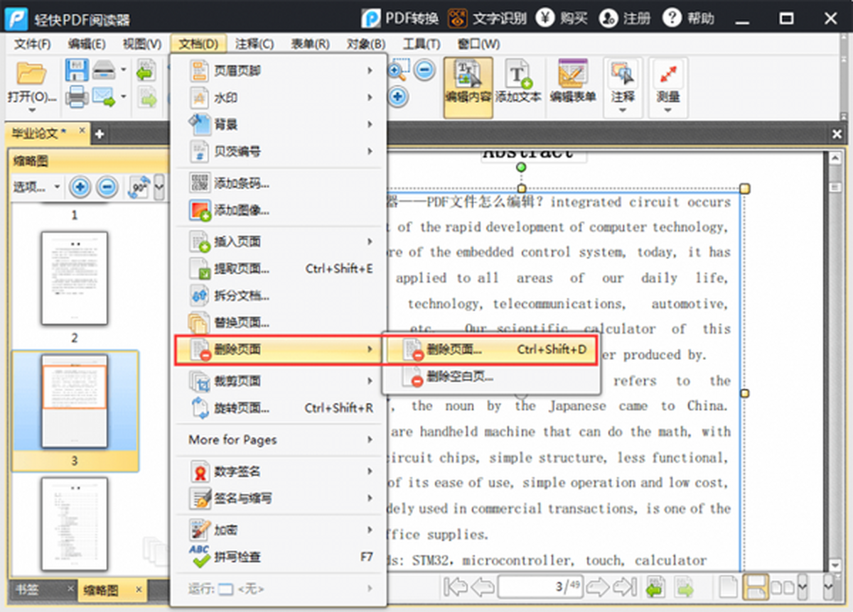 鼠标指向“文档”,然后选择“删除页面”,有三个选项:选择页、当前页、页面(可批量删除连续或不连续的页面)