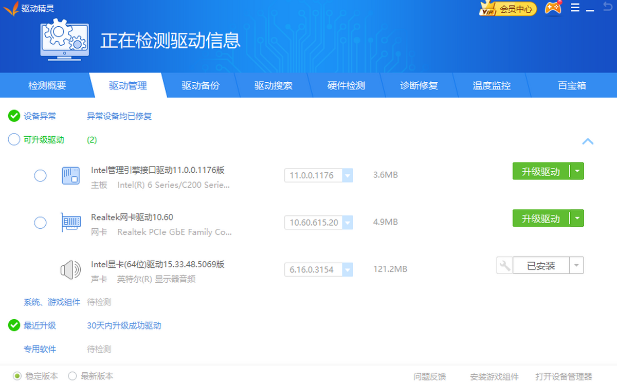 2、使用驱动精灵兼容版安装、升级硬件驱动,可以让电脑保持最佳运行状态,对新游戏有更好的支持,新驱动往往能提高游戏运行速度和帧率。