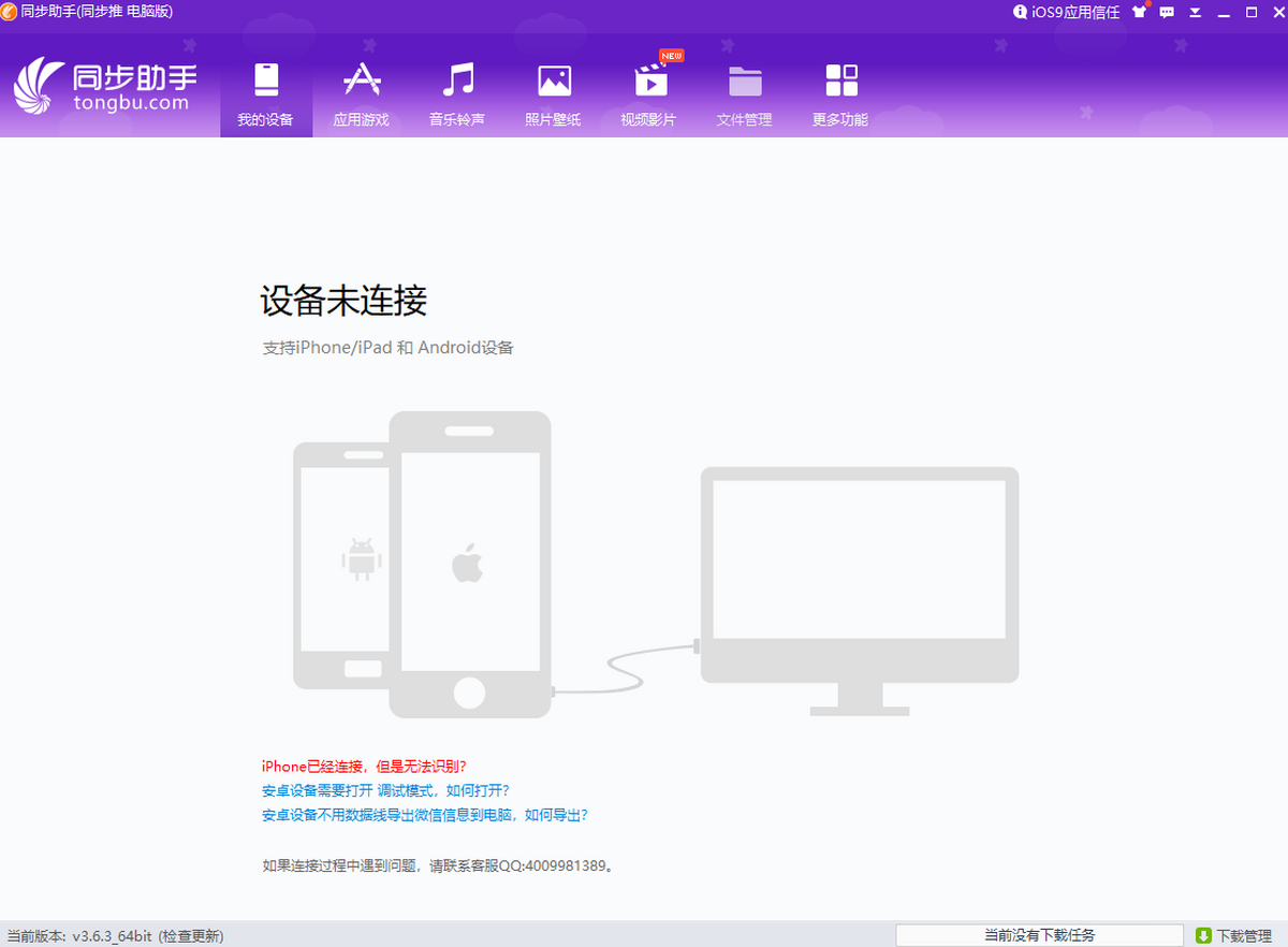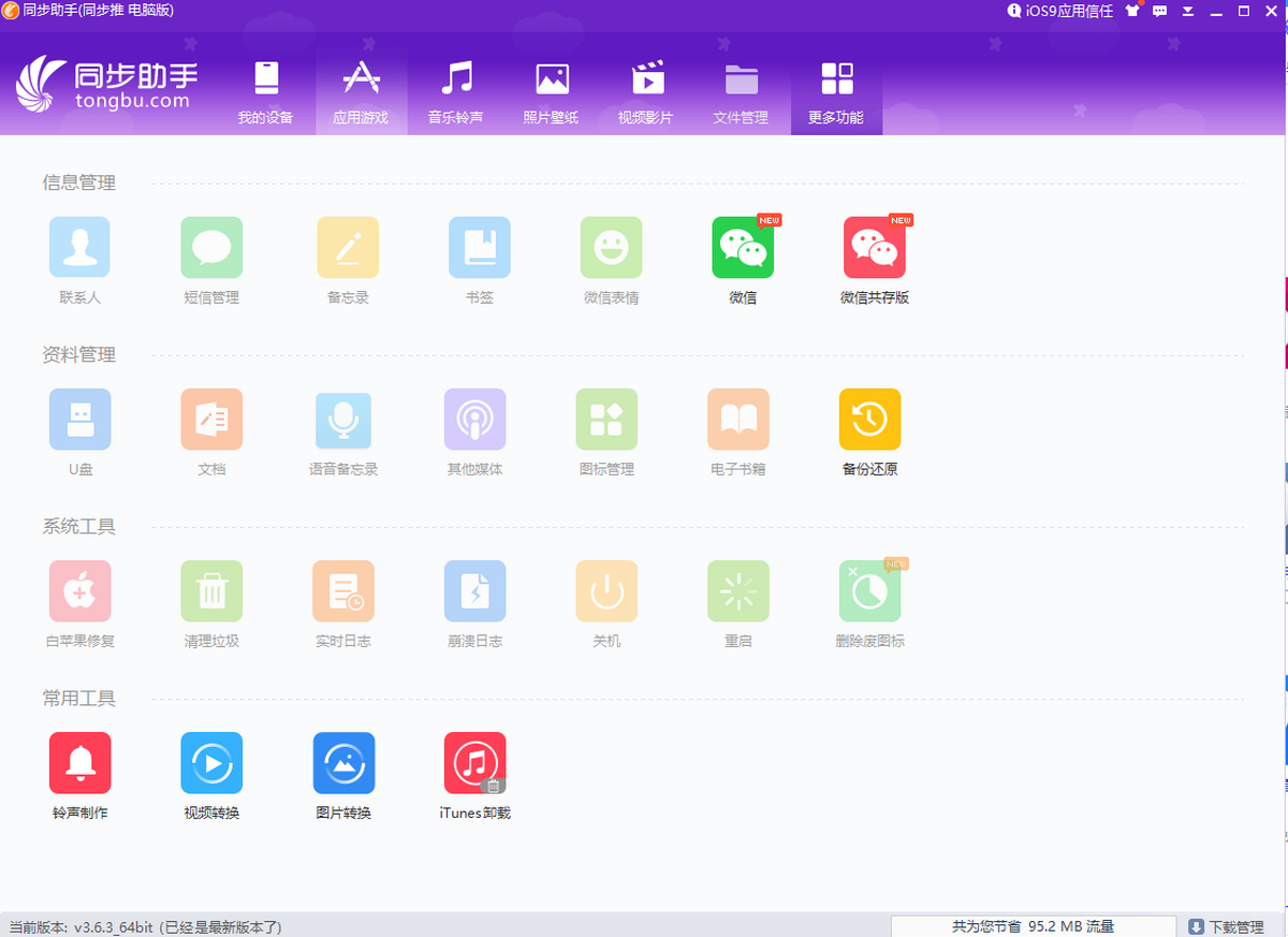 同步助手是一款通过电脑全面管理iPhone、ipad、安卓手机等移动设备的手机助手,游戏应用免费下载,下载速度更快三倍 。简简单单同步照片、音乐、视频。不仅是首家实现微信记录备份功能的iOS设备管理工具,还有PhoneClean的垃圾清理功能。