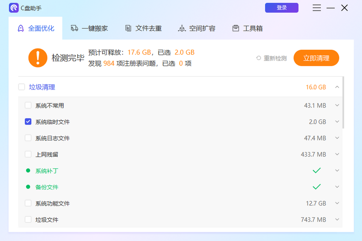 百贝C盘助手是一款专业系统垃圾清理工具。百贝C盘助手不仅能将电脑使用过程中系统、软件等产生的日志文件、临时文件、缓存文件、无效的注册表信息等垃圾文件进行清理,还能将系统磁盘中非Windows系统文件转移到非系统磁盘分区。同时能协助用户查询筛选重复文件数据,并根据自己需求删除相应的重复文件。