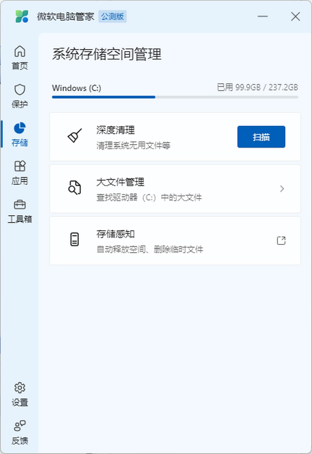 1、新增系统存储空间(C盘清理、大文件管理)管理功能;