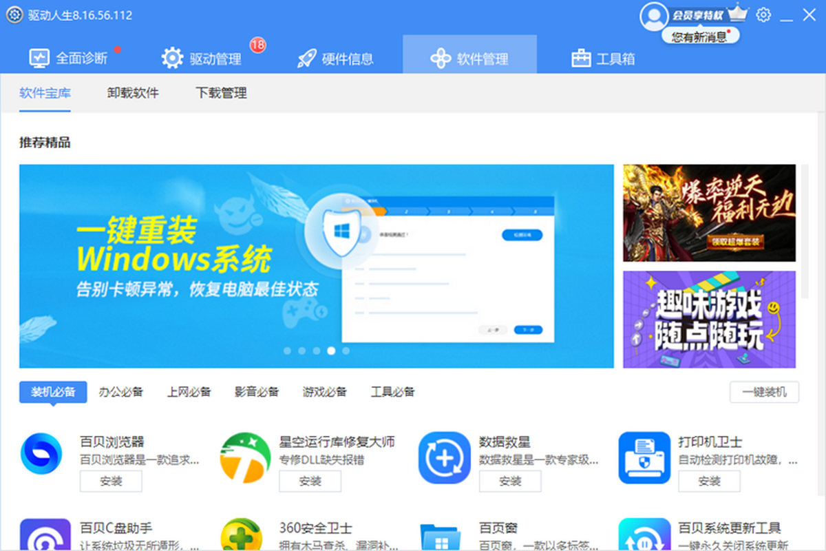 驱动人生8是一款热门电脑驱动硬件管理软件,软件的功能强大,这里为大家提供声卡、网卡等各种驱动下载,能实时帮助你全面检测电脑驱动,一键快速帮你修复电脑问题,支持win7、win8、win10等多种电脑系统,支持大量品牌笔记本和台式机,可谓是用户的装机必备软件。