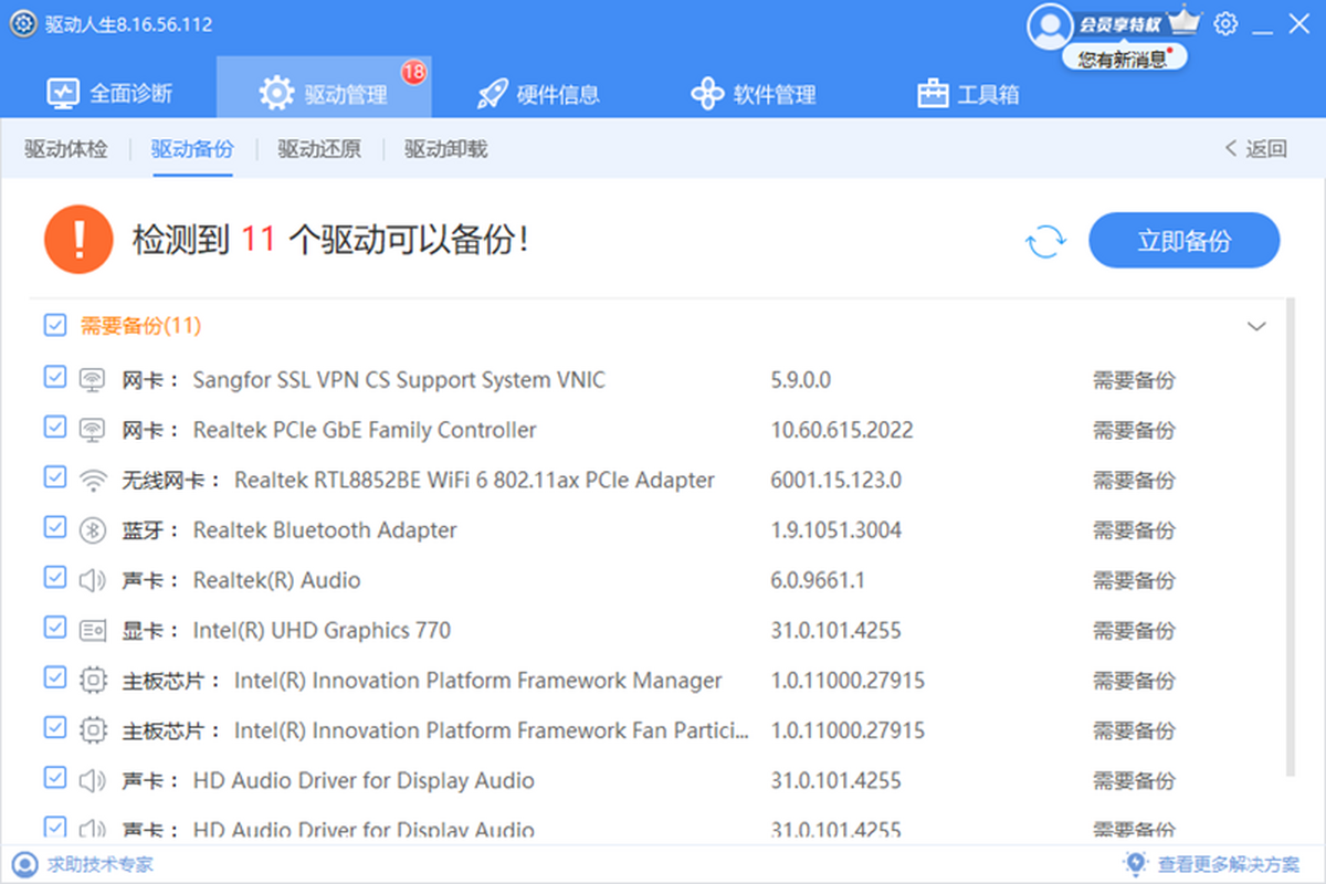 驱动人生在每次更新变动之后会自动或提示您备份最新的驱动并能全程协助管理,您只需点一下鼠标确认即可轻松完成。在系统故障、重装系统等状态下可选点几个快速完成驱动快速恢复。