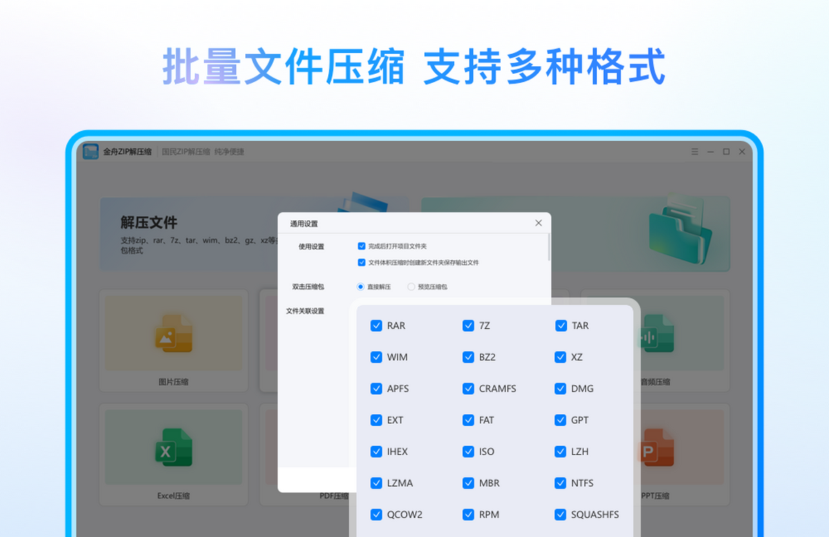 winzip,rar,7z文件解压缩,纯净安全无广告,图片压缩,视频压缩,音频压缩,GIF压缩,PDF压缩,Word压缩,PPT压缩,Excel压缩;金舟ZIP解压缩是全球领先的文件压缩、加密、实用软件,纯净便捷,安全无广告,节省时间和空间,快速压缩和解压缩文件,支持打开的压缩文件的格式有:Rar , Zip , 7z, bz2 ,bzip2, tab2, taz, gz, gzip, tgz, tar, xz, txz;支持压缩成zip文件,支持文件图片、音乐、视频、日常办公文档等几十种类型文档浏览,为您节省资源空间,给您带来高效便捷的使用体验!