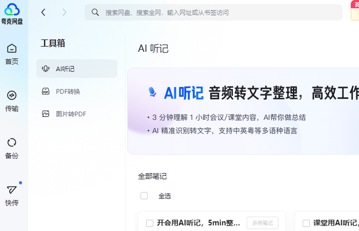 文件太多找不到?首页新增内容化卡片,快速查看最近文件和转存文件;PDF转换、AI听记和回收站等网盘常用工具,都可以在首页快速使用
