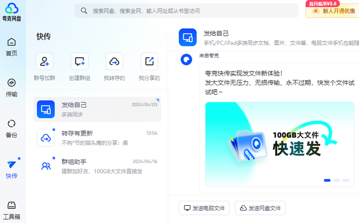 2、快传体验升级:群组里的文件支持一键直接下载,下载后在网盘传输页面可找到
