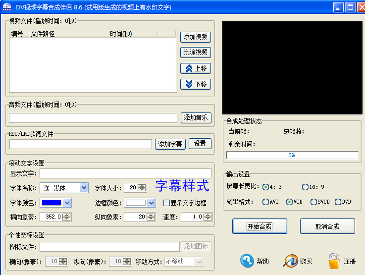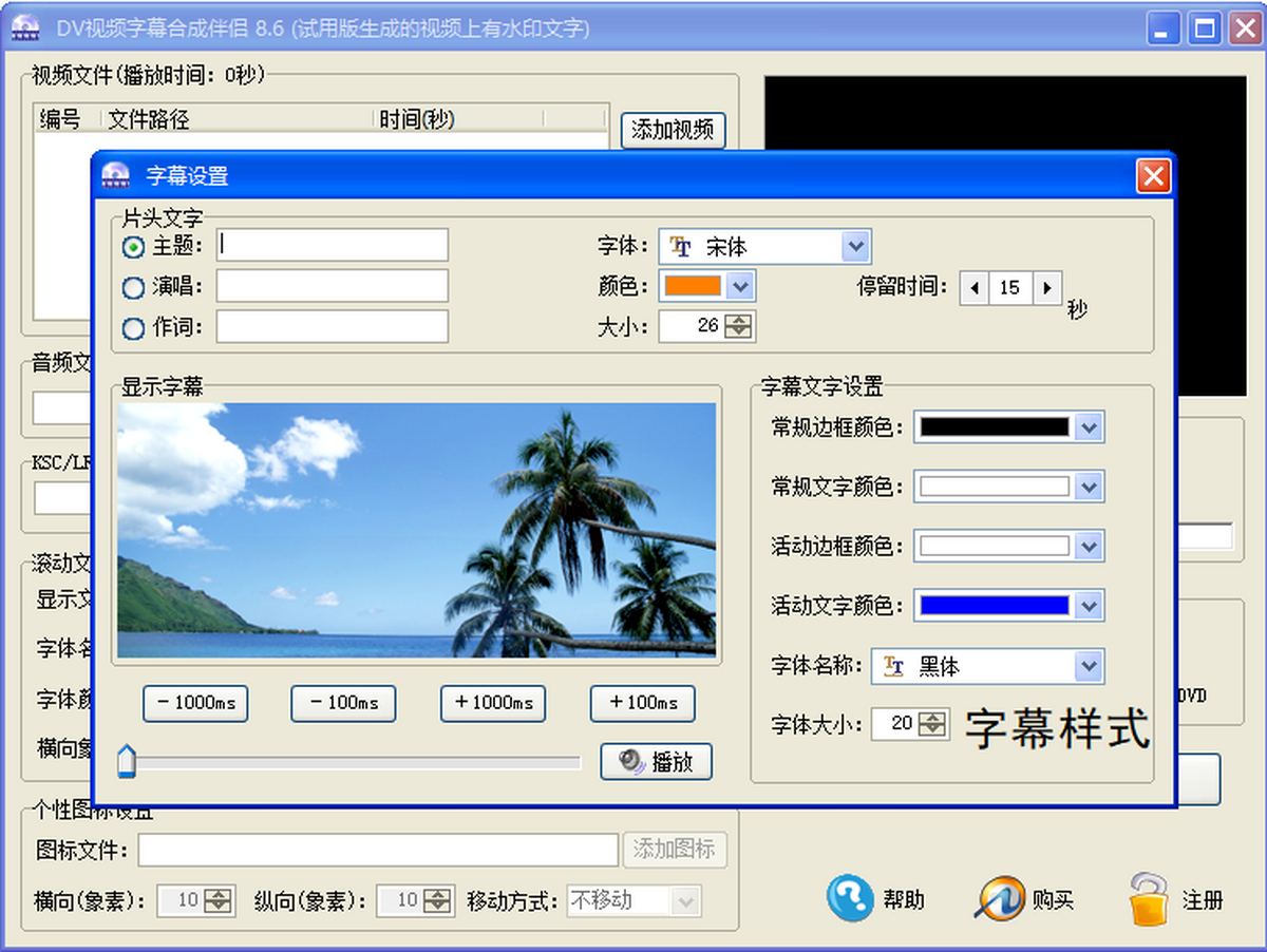 DV视频字幕合成伴侣(视频字幕制作软件)是一款非常实用的能够将WMV、ASF、VCD、MPEG等视频文件中加入卡拉OK字幕或普通字幕的软件。