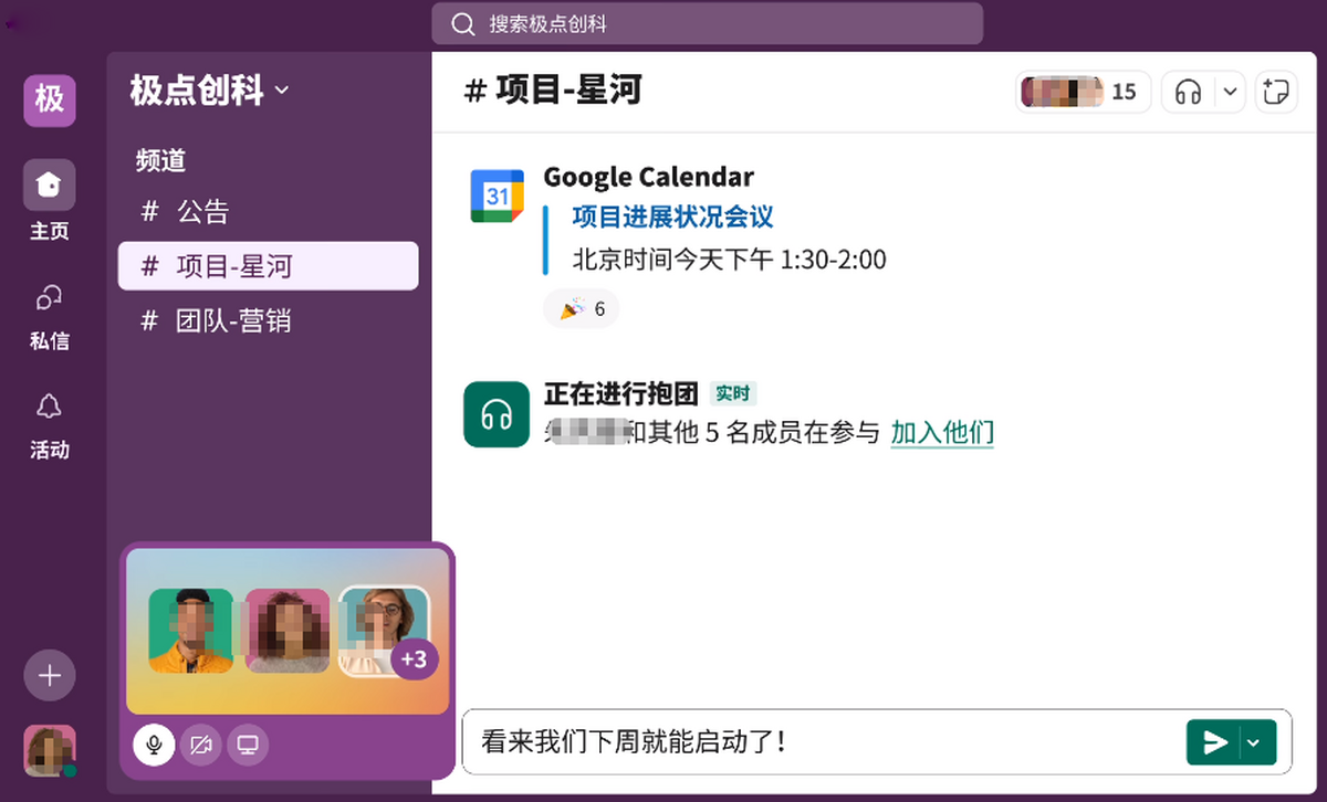 频道为你和你的团队提供完成眼下工作的共识。当频道中的所有成员都能访问相同信息时,大家除了能够步调一致外,新成员也能在加入时获得全面了解。当你想要说话时,只需使用 Slack 抱团就能开启实时对话。