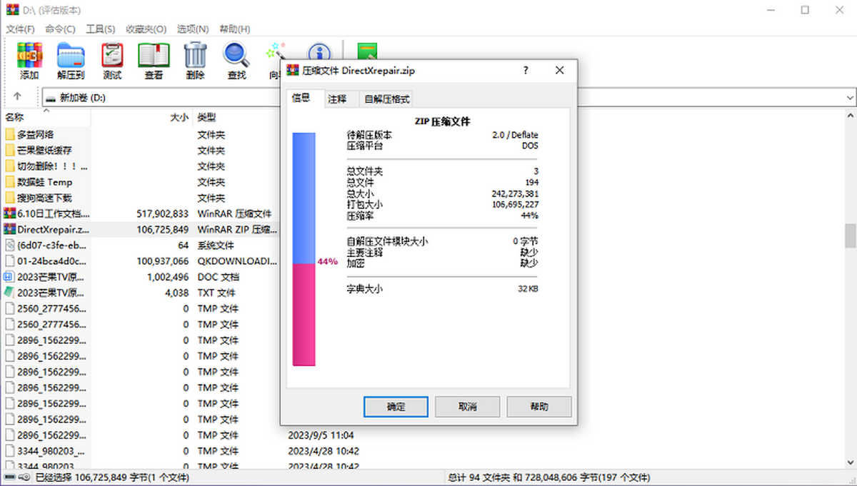 WinRAR高达50%以上压缩率,使其成为压缩/解压RAR格式的首选软件。WinRAR既可以解开ZIP格式的压缩文件,又可以生成ZIP压缩格式的文件。RAR格式一般要比WinZIP的ZIP格式高出10%~30%的压缩率。针对WAV、BMP声音及图像文件,WinRAR其采用独特的多媒体压缩算法大大提高压缩率。WinRAR不但能解压多数压缩格式,且不需外挂程序支持就可直接建立ZIP格式的压缩文件,对受损压缩文件的有极强的修复能力。对于在网上下载因头部受损而导致不能打开的ZIP、RAR类文件,用WinRAR调入后,只须单击界面中的“修复”按钮就可轻松修复,且成功率极高。能建立多种方式的全中文界面的全功能(带口令)多卷自解包,并通过“锁定压缩包”来防止人为的添加、删除等操作,保持压缩包的原始状态。WinRAR还可通过命令行方式行使批处理命令。