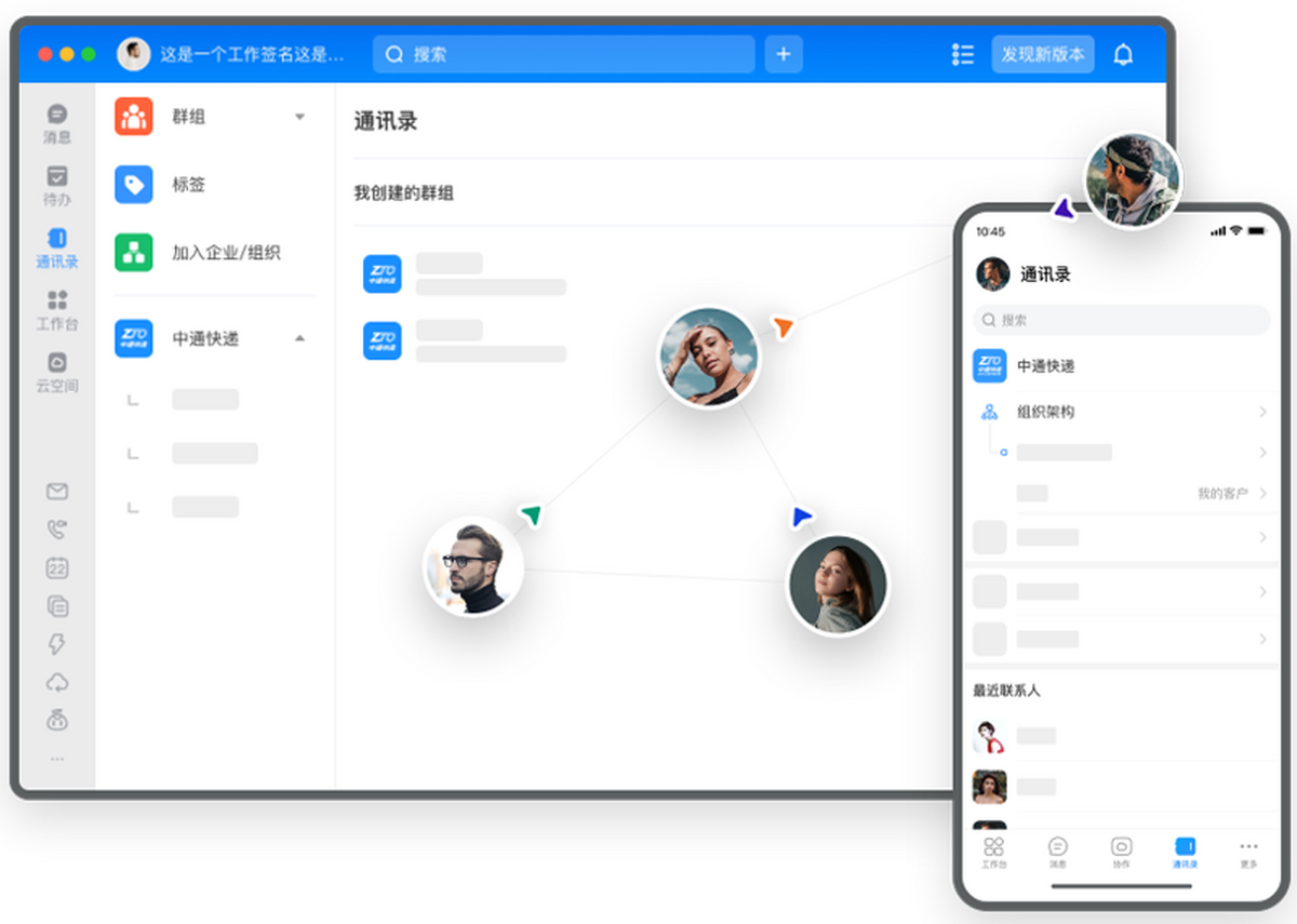 作为在线协作核心组件,基于生态圈构建的企业通讯录,支持多租户用户展示,围绕实际业务架构组织通讯录树状结构,贴近各方使用习惯,随时找人、随处沟通 即刻体验